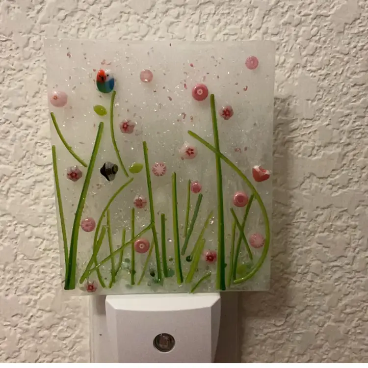 Nightlight, kiln made with love by me! Unique and varies in color placement, bubbles and depth of field. Shiny on the front, textured on the back, glass approximately 3.75” x 3.25”-inches: with light 5.5". Made with Bullseye glass with a variety of elements from other artists. Nightlight hardware is new; LED. SIGNED