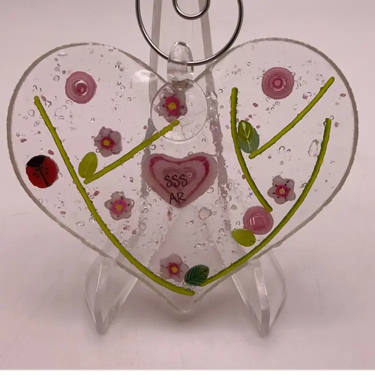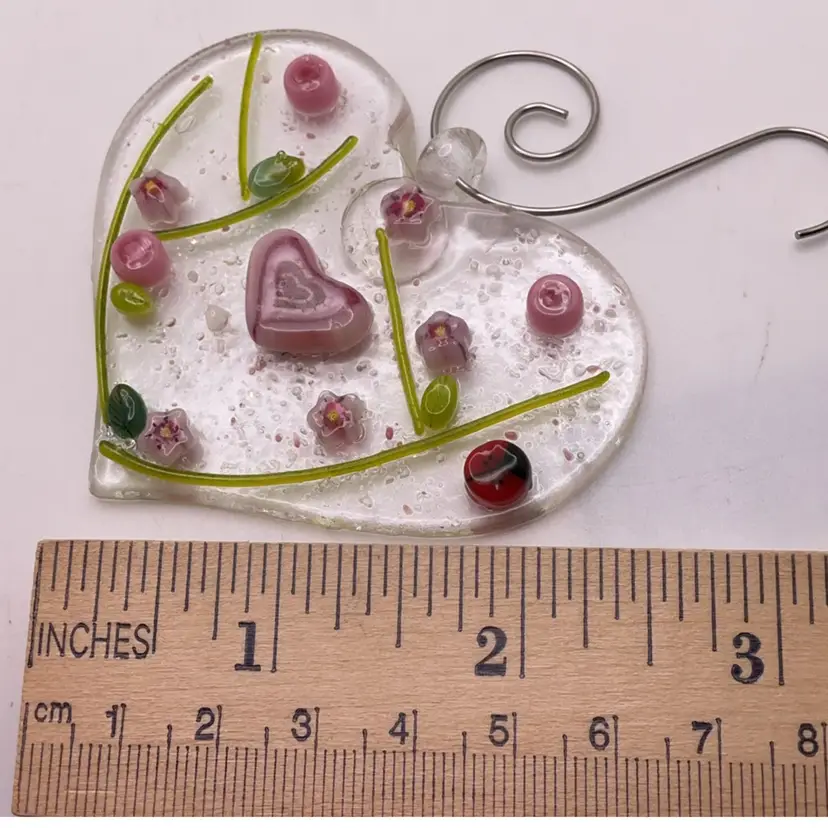 Made by Me! Fused Glass Ornament Heart with 3D Pink Heart & Ladybug 3" x 2.5" Handcrafted Studio Art