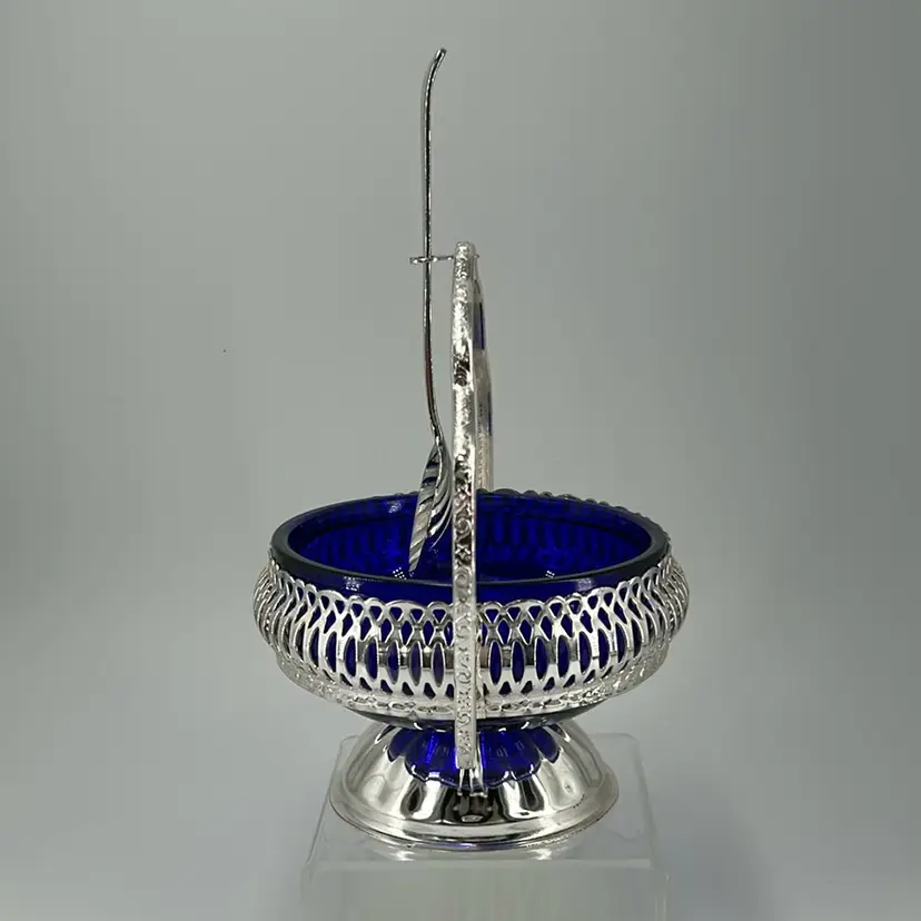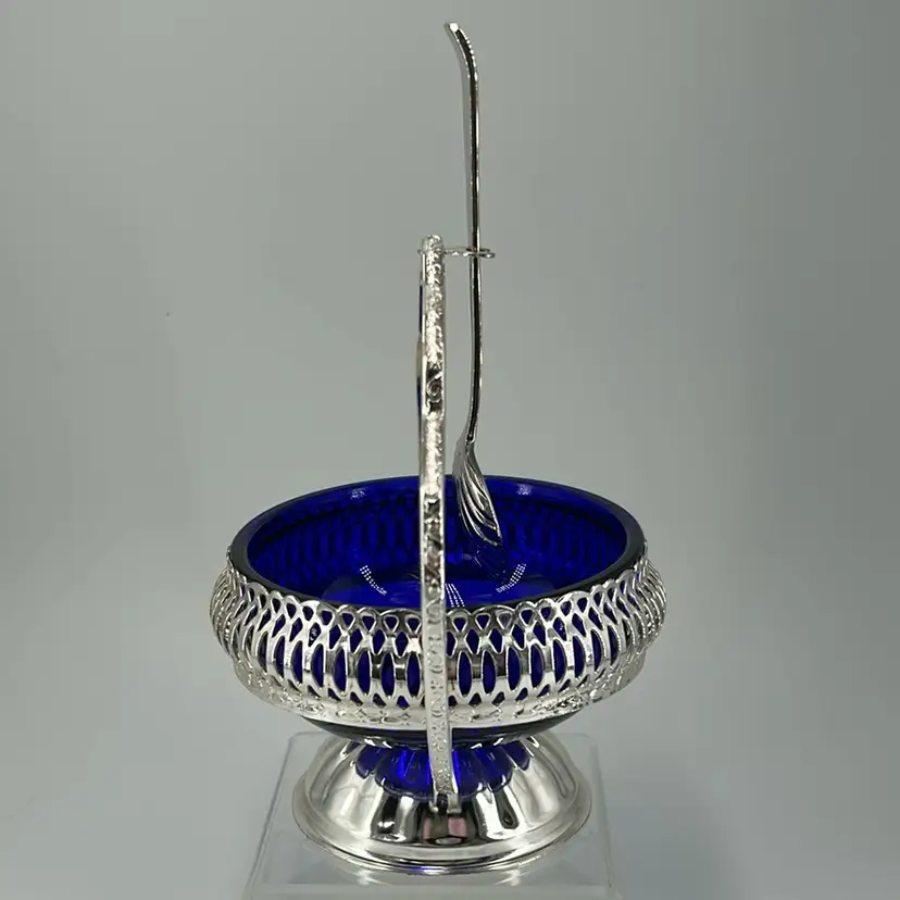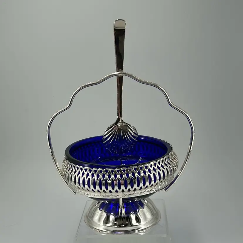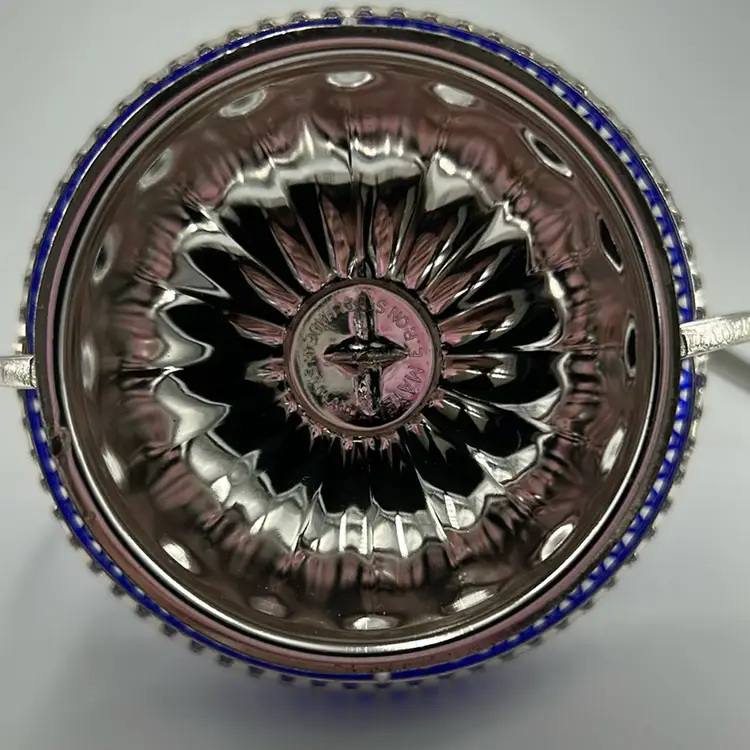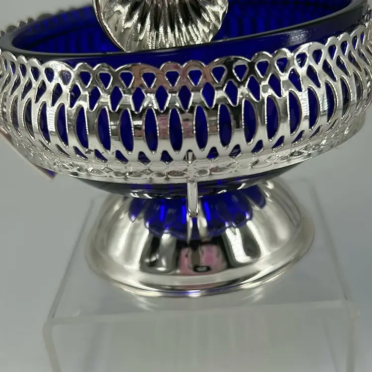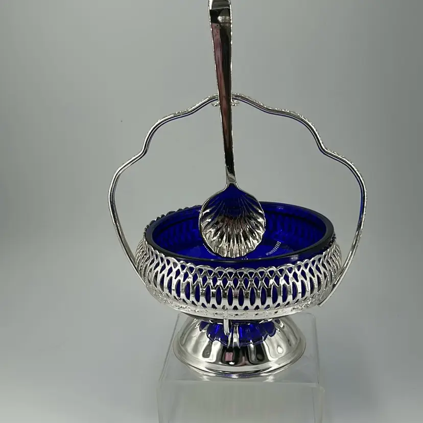 This piece is a male and company, queen and silver plated, blue jam, or sugar bowl with spoon. It is noted for its combination of silver plating, and cobalt blue glass. Five to the top of the handle is about 5 1/2 inches. It’s diameter is approximately 4 inches and there are no condition issues.