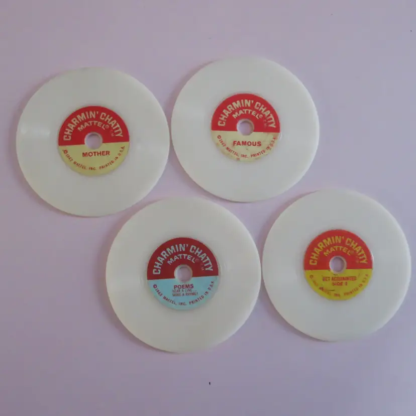 These sound discs would go into Mattel's Charmin Chatty doll. Unlike other ones in production, this one used these sound inserts. The doll had no internal sound, only these.