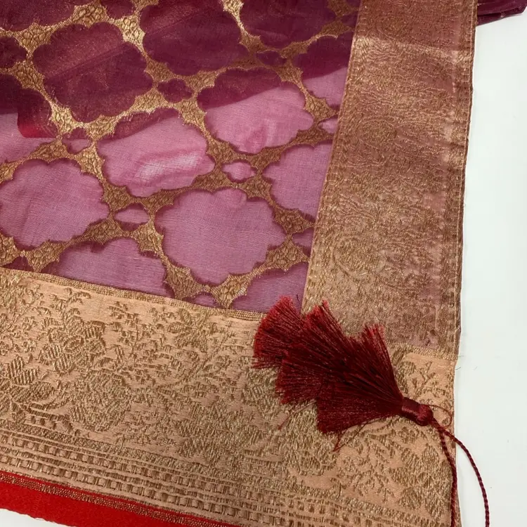 This is a Maroon Handloom Banarasi Saree with golden zari Kadhwa motifs from May-rah-kee. NWT 86” x 38.5”