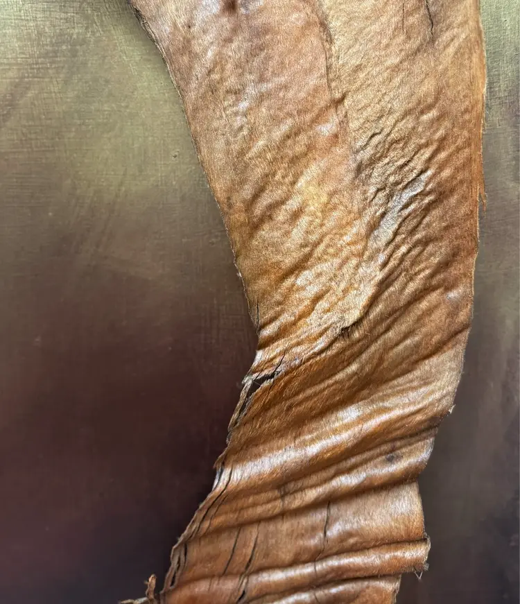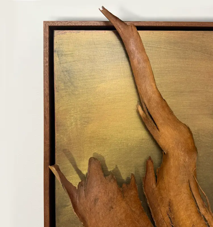 Wall Sculpture featuring unique Eucalyptus tree bark, mounted above a hand-painted panel with a custom hardwood frame.