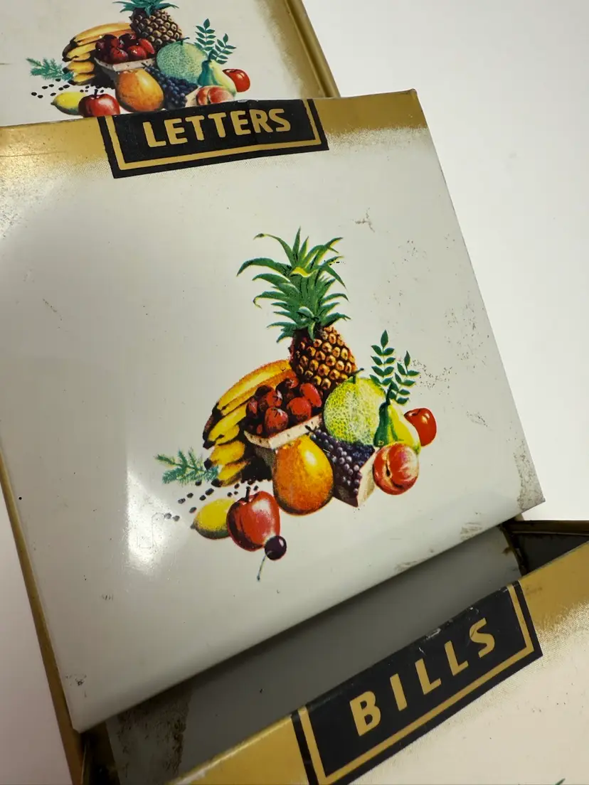 Metal mail holder with pockets for letters, bills, and a slot for miscellaneous. Ivory colored worth gold accents. Vivid fruit design on each pocket
