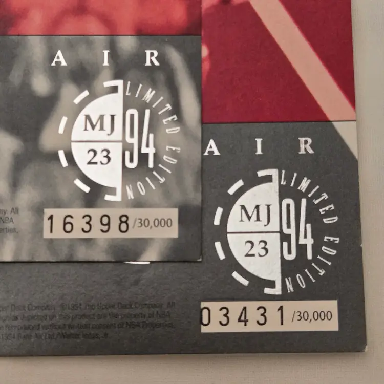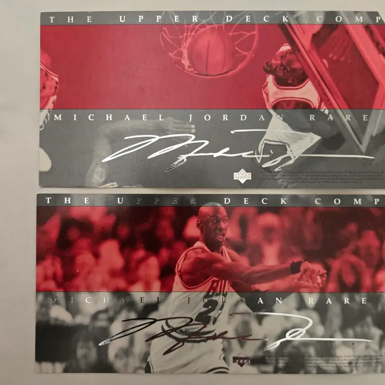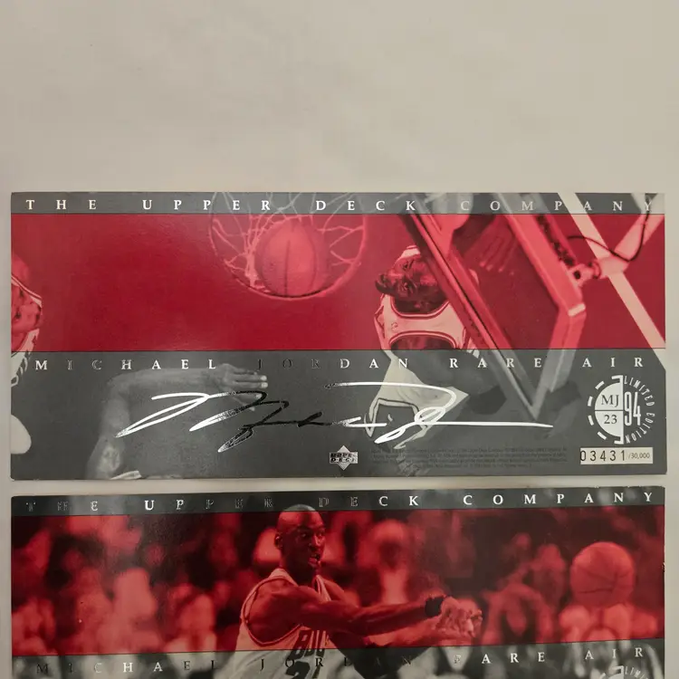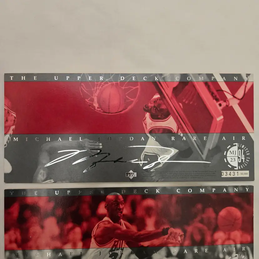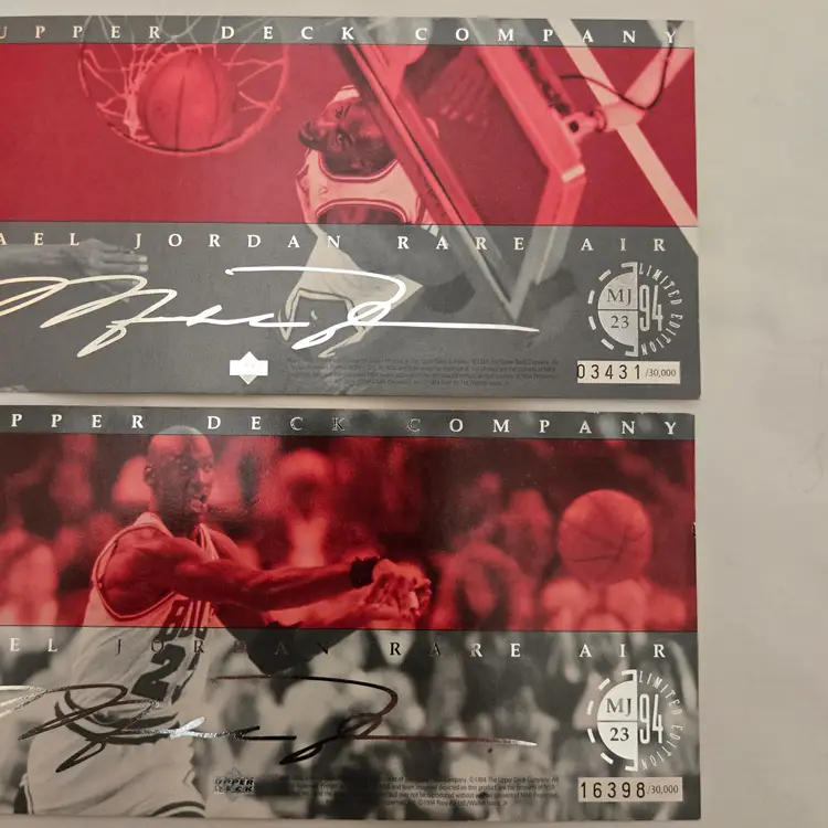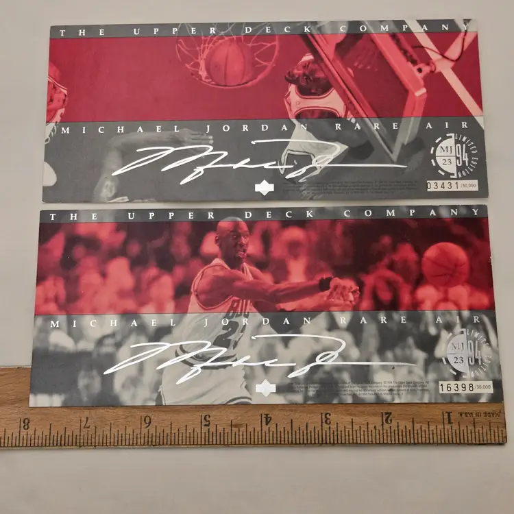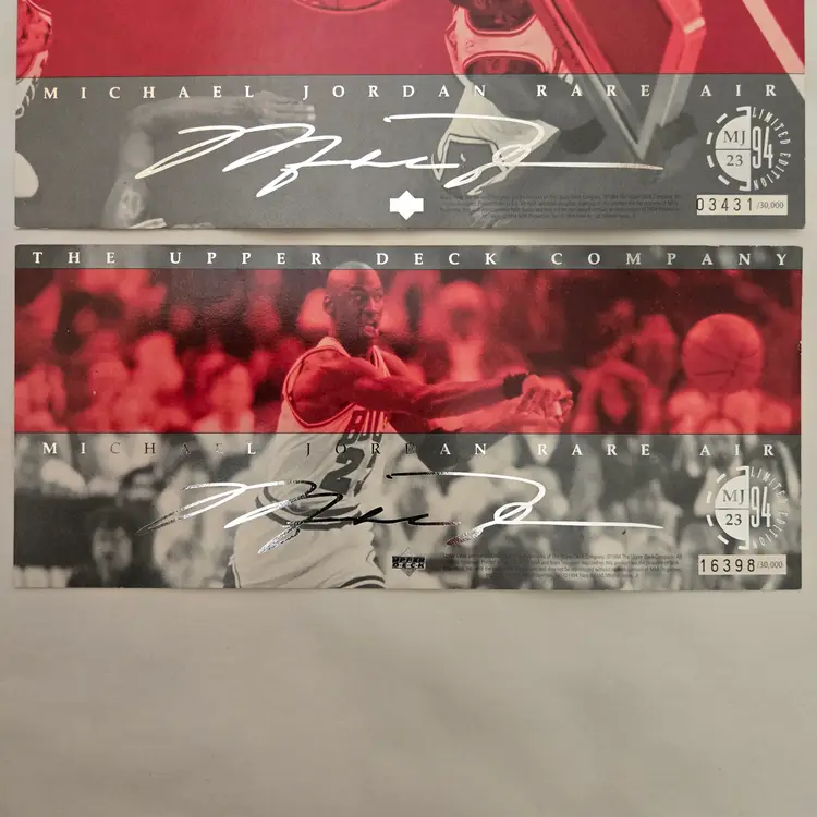 Michael Jordan 1994 Upper Deck Rare Air Limited Edition Jumbo Cards (set of2) /30,000 each. Used condition with some bumps to corners, edgewear and slight bit of yellowing to backsides. Please view all the photos and please ask any questions prior to purchase when possible.