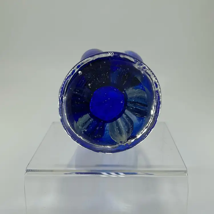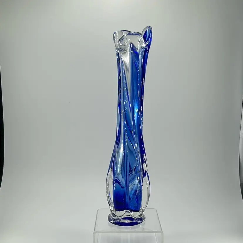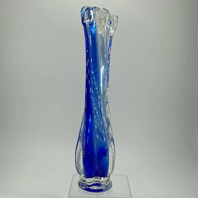 This piece is a hand blown art glass vase crafted from cobalt blue glass. It has an elongated shape and a distinctive swirling design. it stands 9 inches tall and 2 inches across the opening. There are no chips or cracks.