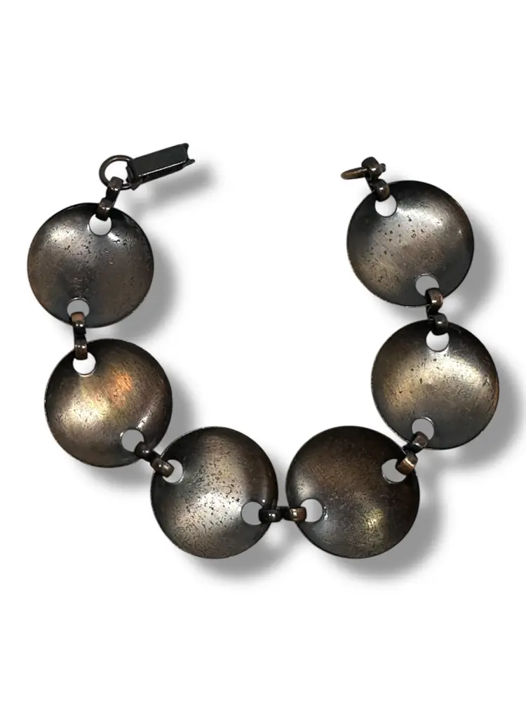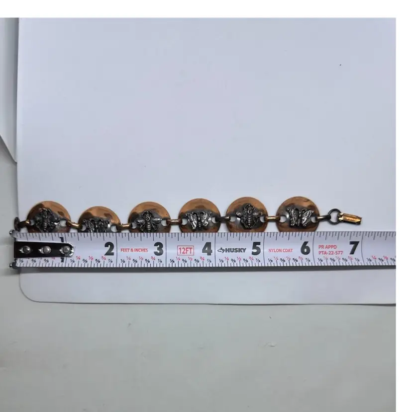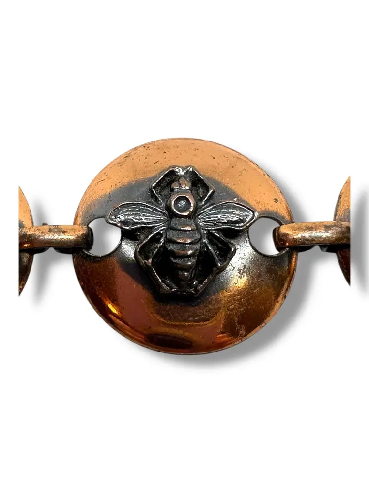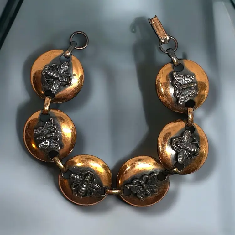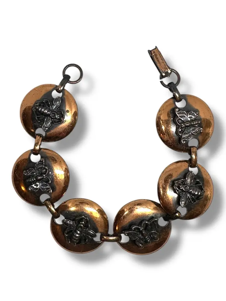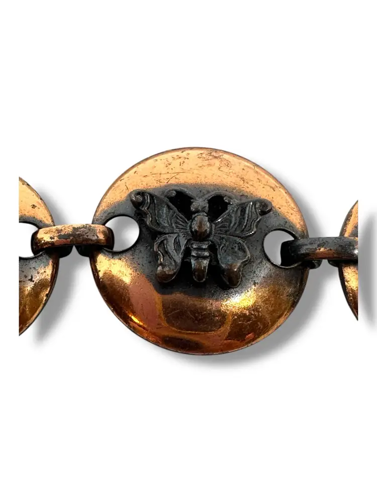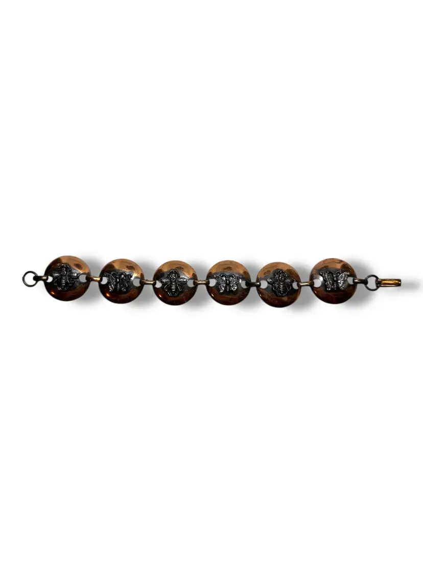 Mid-Century Vintage Solid Copper Link Bracelet With Butterflies & Bees Raised Bugs Insects. 7 Inches