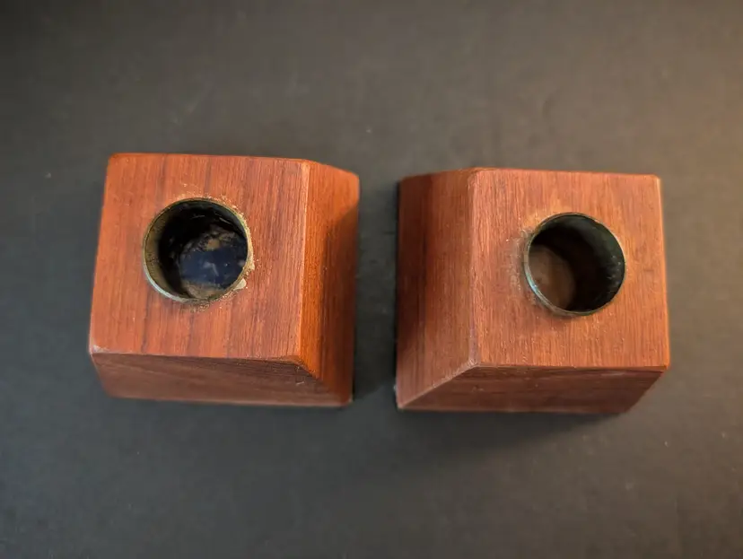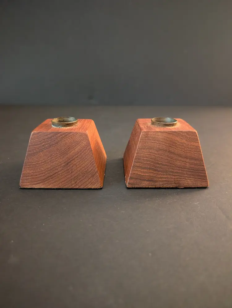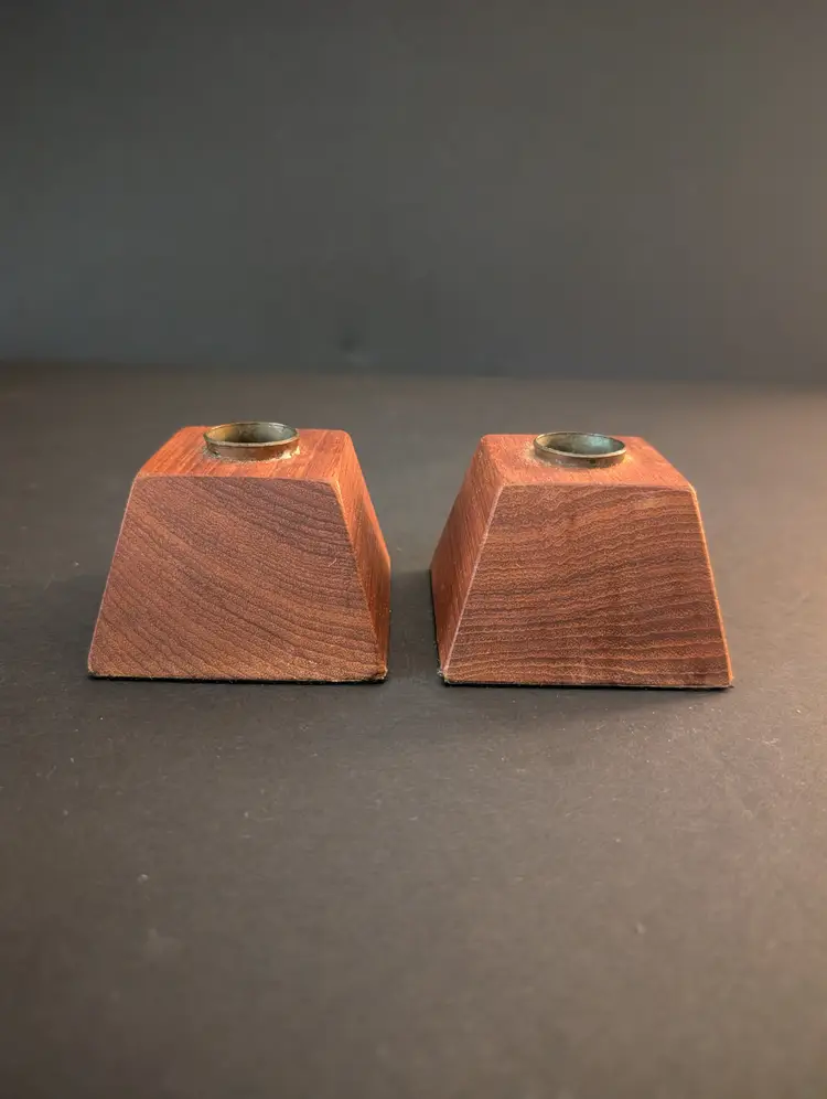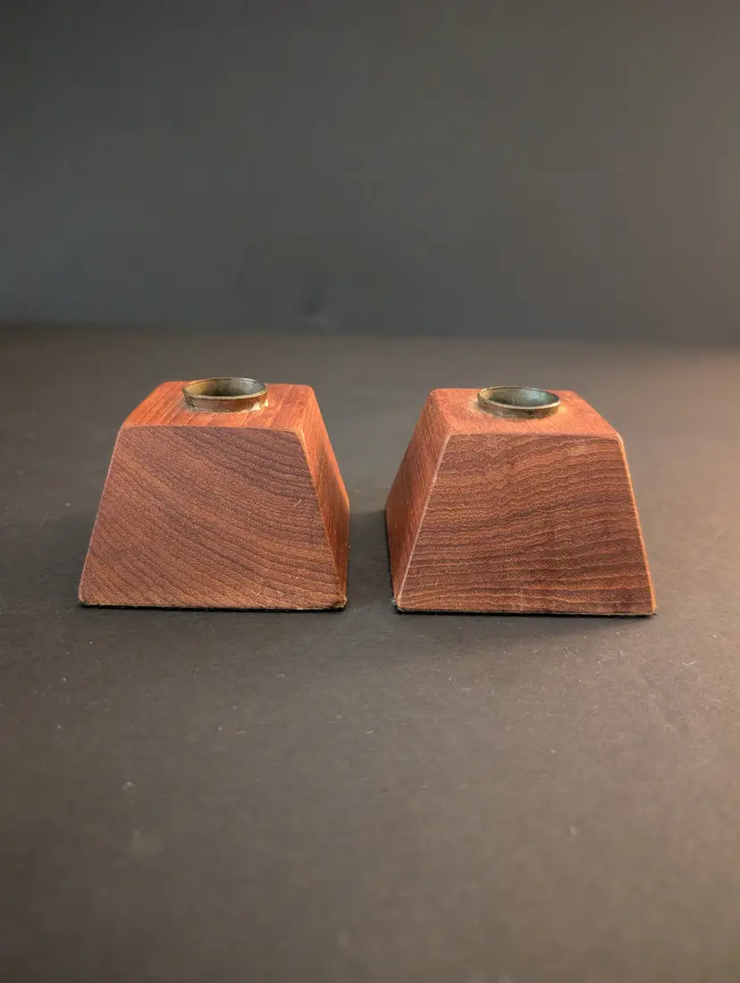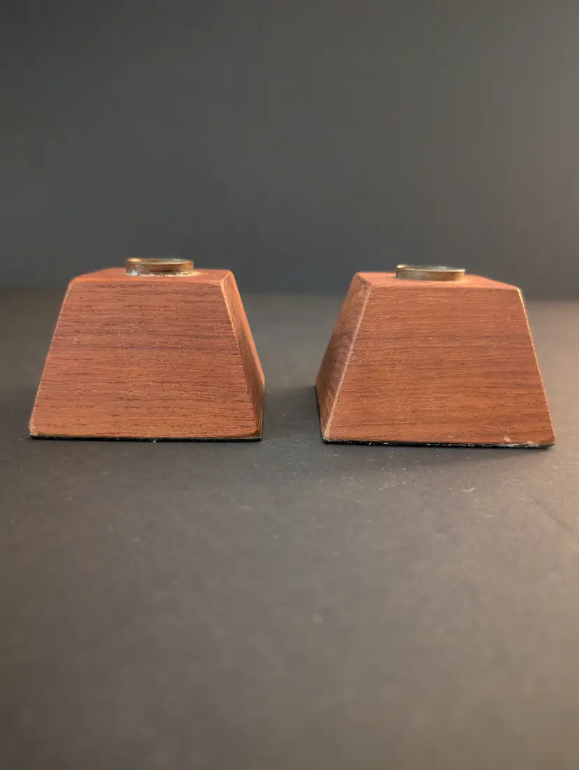Enhance your decor with this timeless set of mid-century wood and brass candle holders. Perfect for adding a touch of elegance to any room. Classic design with durable materials ensures lasting beauty.