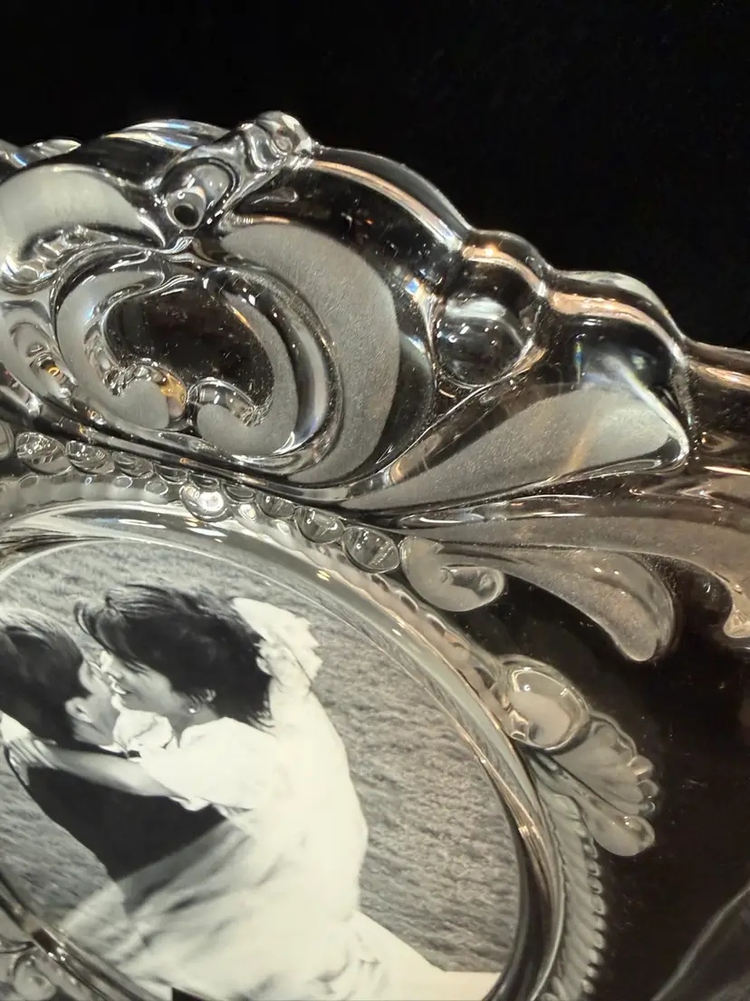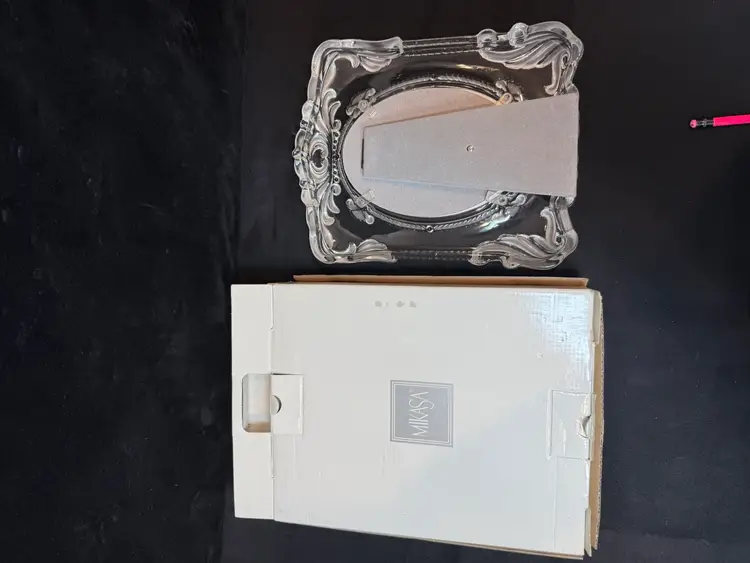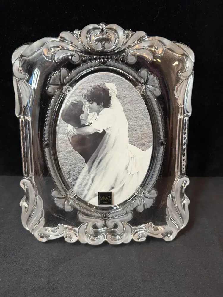 This is a Mikasa Princess lead crystal picture frame. Features a regal and romantic design with ornate scroll patterns in clear and frosted glass. Excellent condition. Never used. Includes original box. 9” x 11” Holds 5” x 7” oval photo