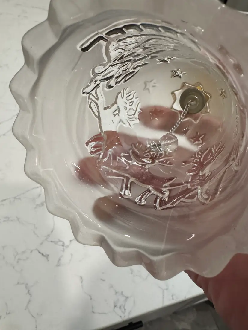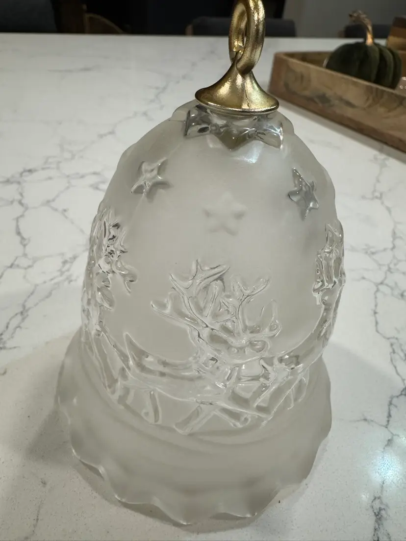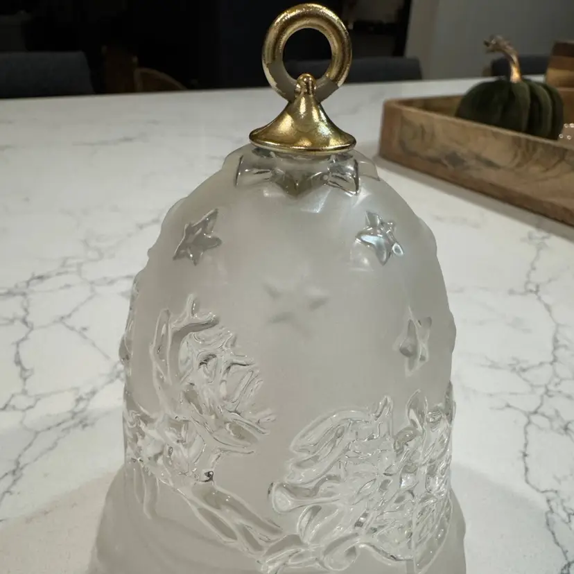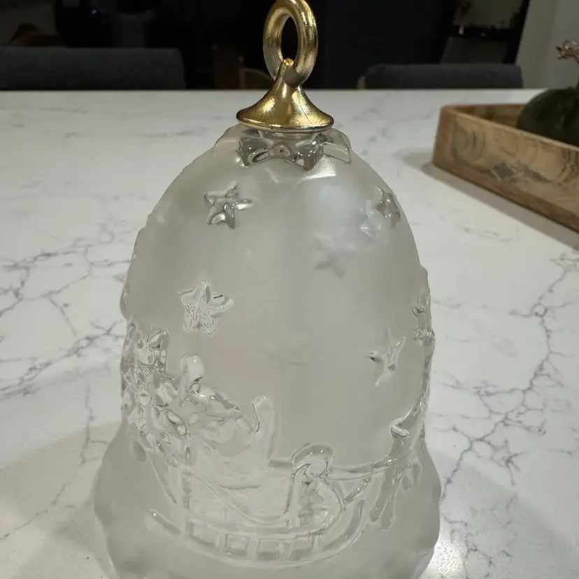 Ring in the holiday season with this beautiful crystal bell. Adorned with delicate frosted designs featuring Santa Claus, his sleigh, and reindeer, this bell captures the magical spirit of Christmas. The frosted finish gives it an ethereal glow, perfect for festive decorations. It includes a gold tone hanger, making it ready to display. Excellent pre-owned condition.