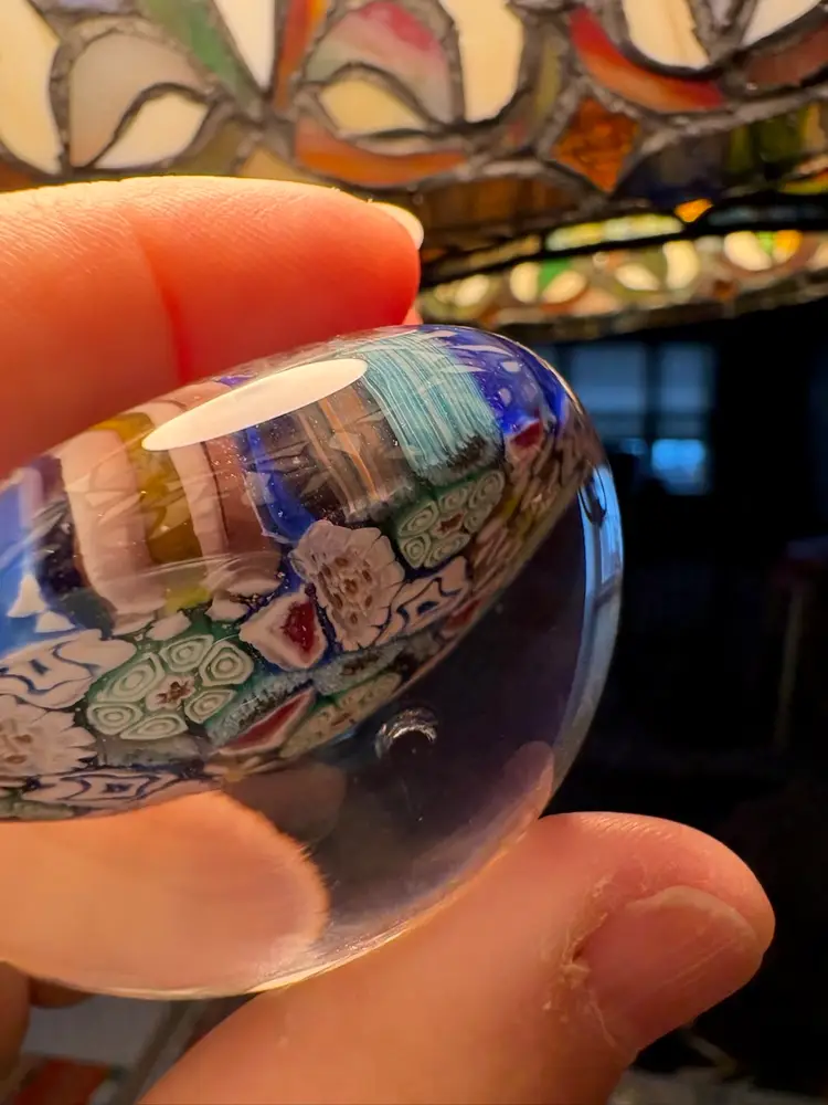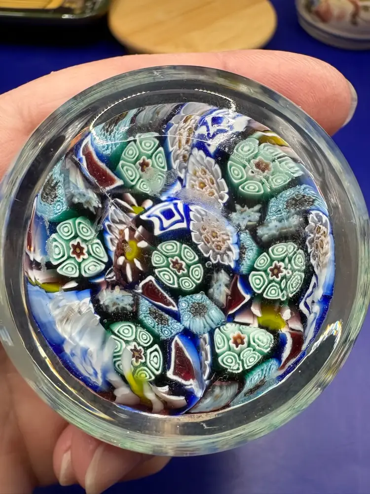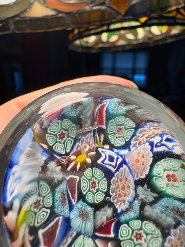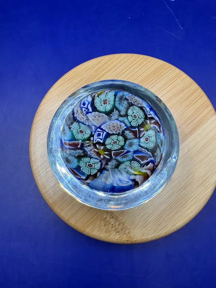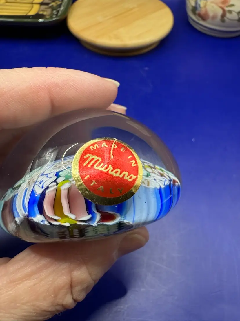 Millefiori paperweight Made in Murano (sticker) Measures 2 inches Swirls of blue red green and white There is scratch on bottom and small one on side … difficult to photo see last 2 photo