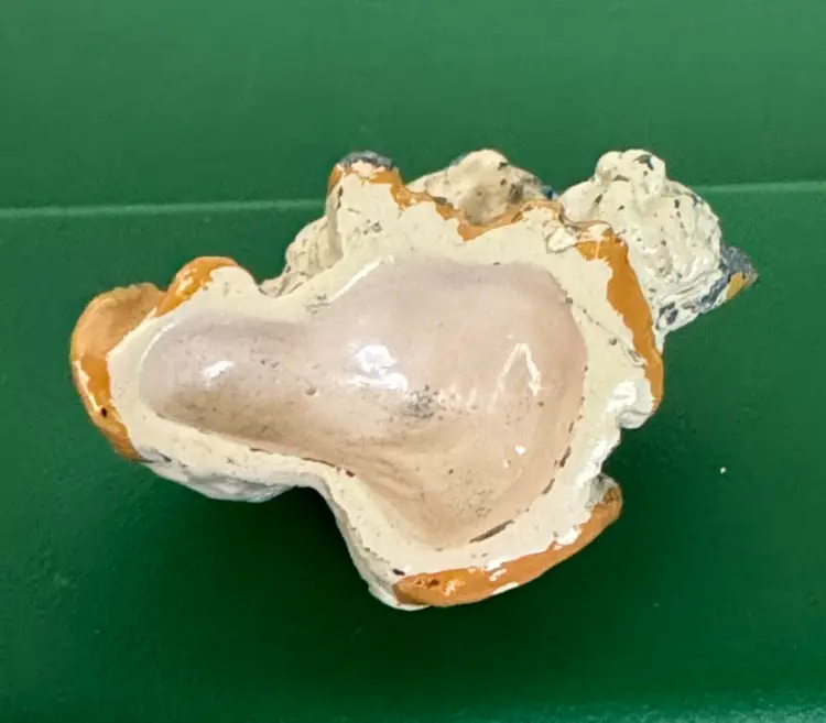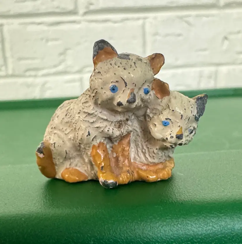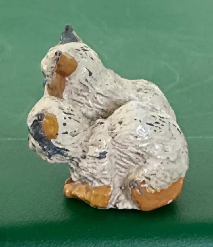 Charming cat figurine in cream and yellow with blue eyes, perfect for pet lovers. 50 Antique dollhouse miniature cats figurine Painted cast iron or metal 1.5” Excellent condition for their age with some paint wear (811261)