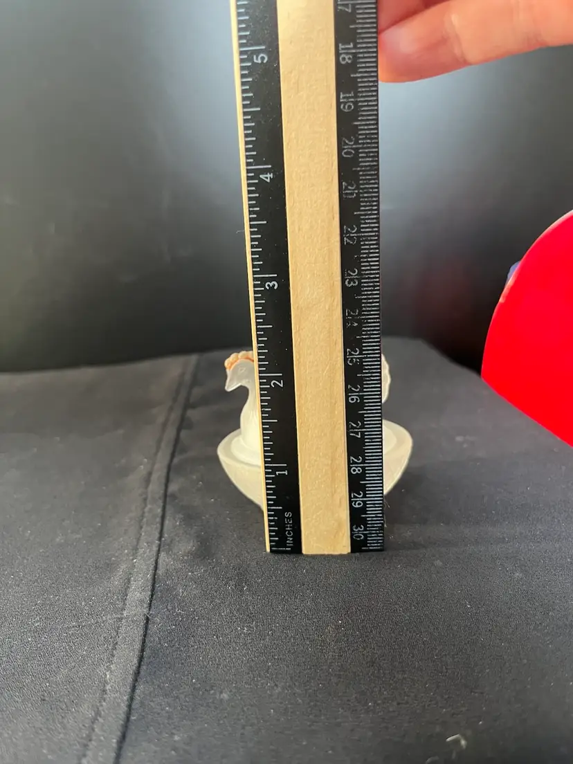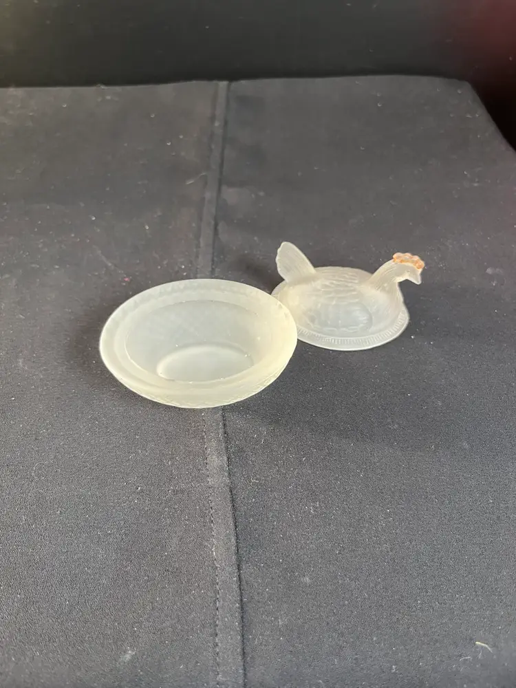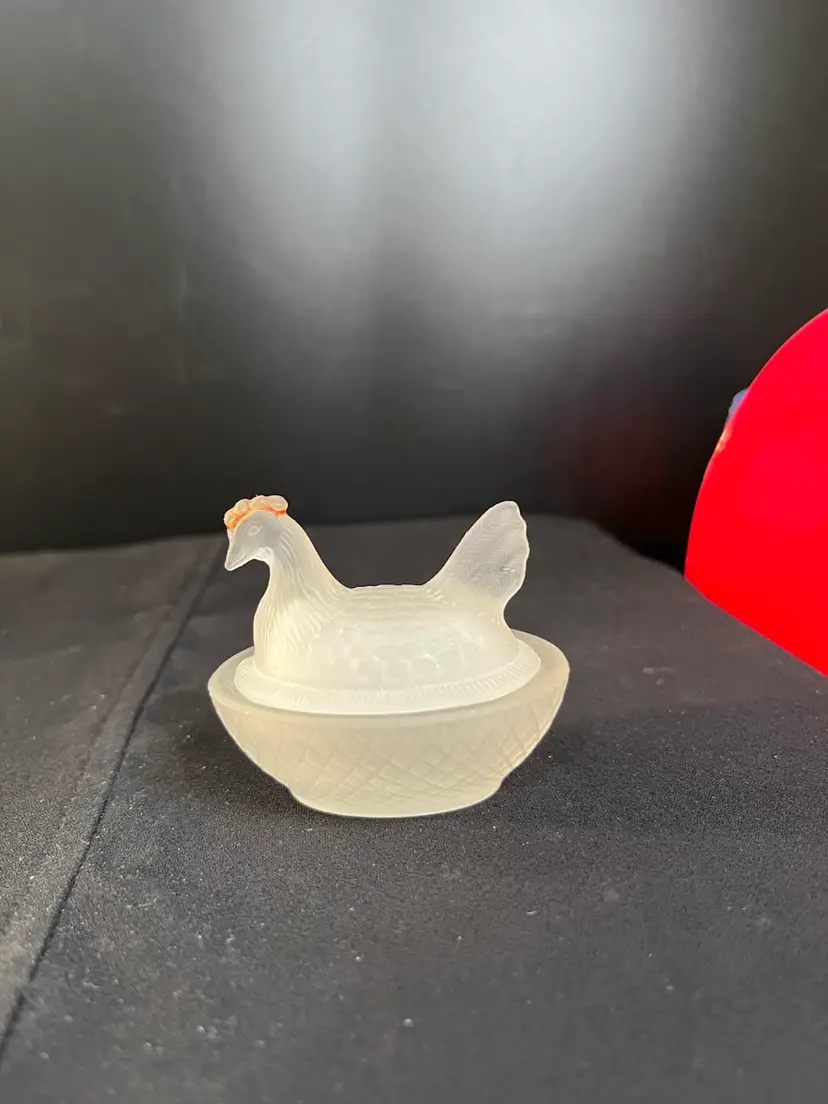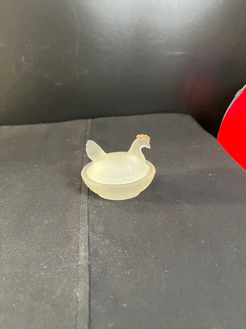 This is a beauty. The nest is textured in a diamond pattern. The hen is textured as though it has feathers. It's comb has remnants of red cold paint. Very tiny flea bites around very inside rim of the dish. Actually is in really good pre loved condition. It measures approx 2.25"H, 2.56"L, 2" Deep, 2.4 Oz
