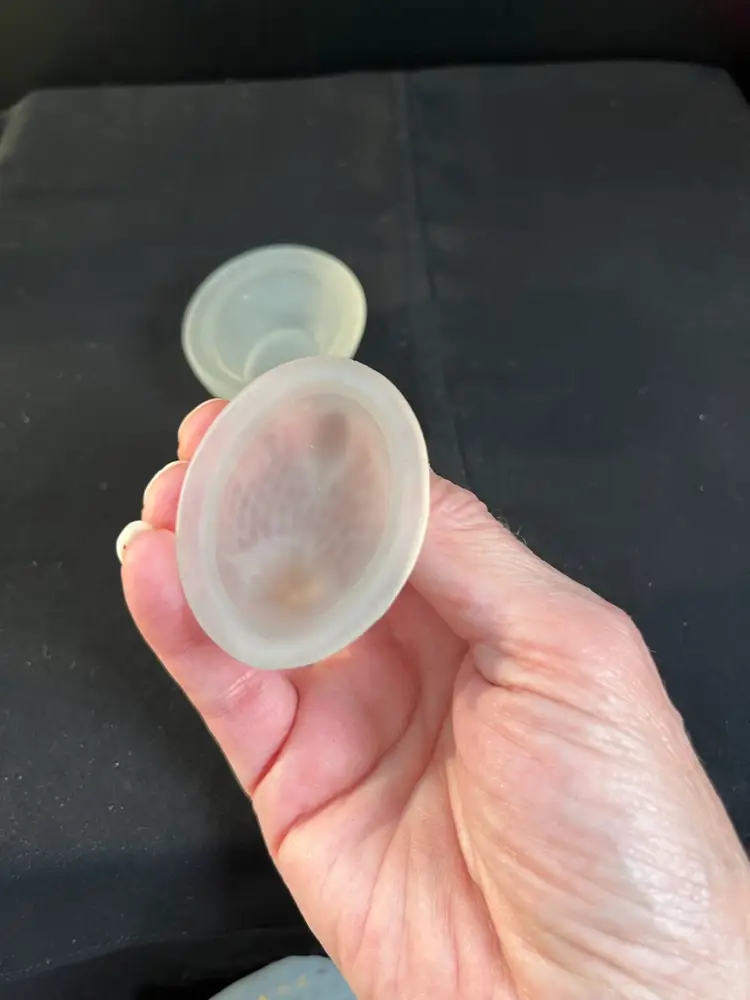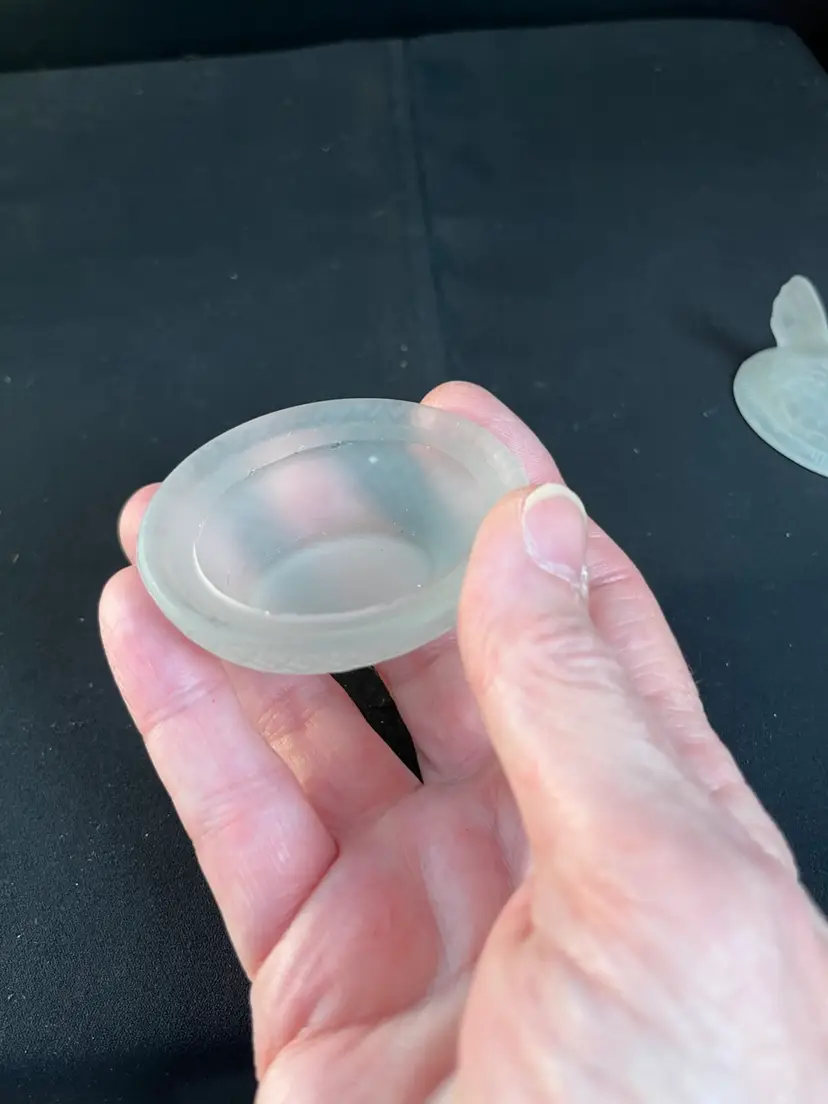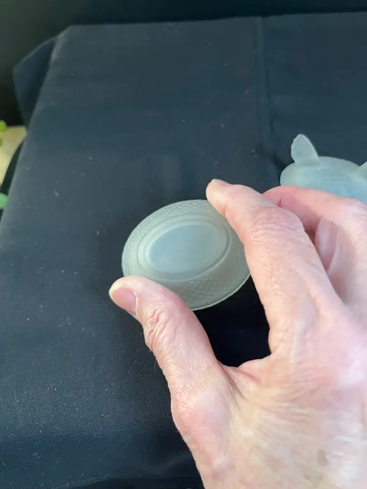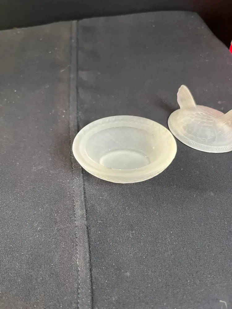 This is a beauty. The nest is textured in a diamond pattern. The hen is textured as though it has feathers. It's comb has remnants of red cold paint. Very tiny flea bites around very inside rim of the dish. Actually is in really good pre loved condition. It measures approx 2.25"H, 2.56"L, 2" Deep, 2.4 Oz