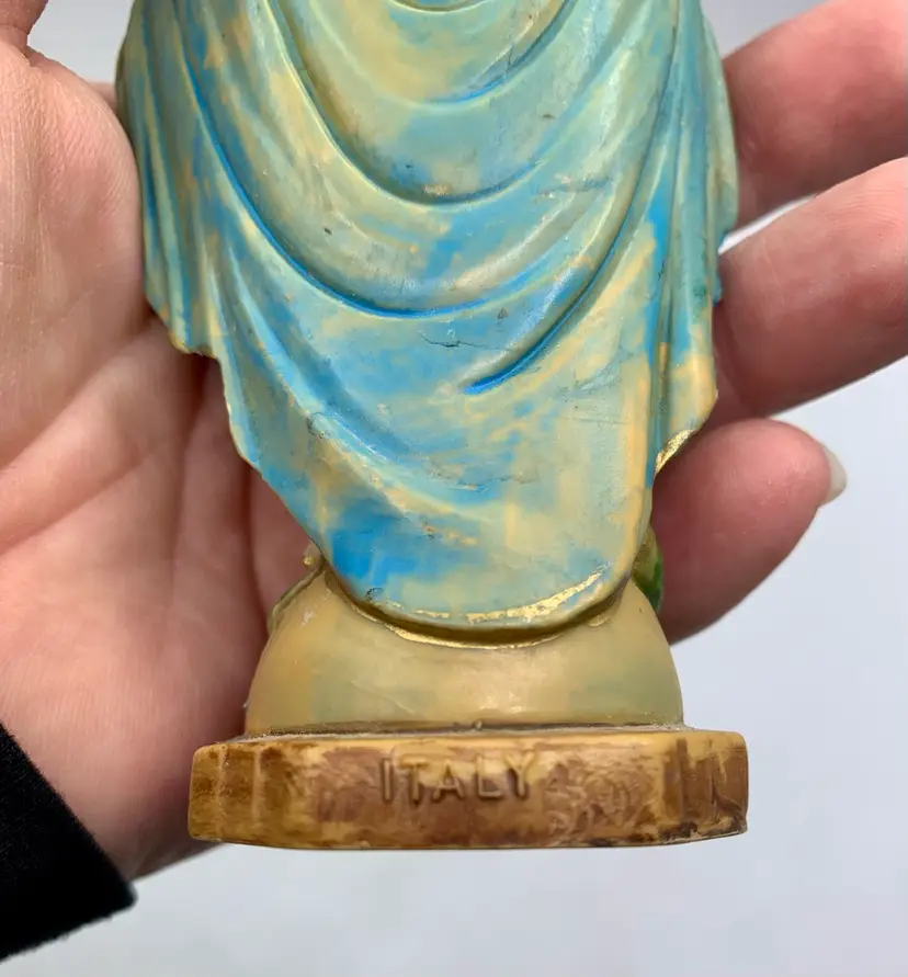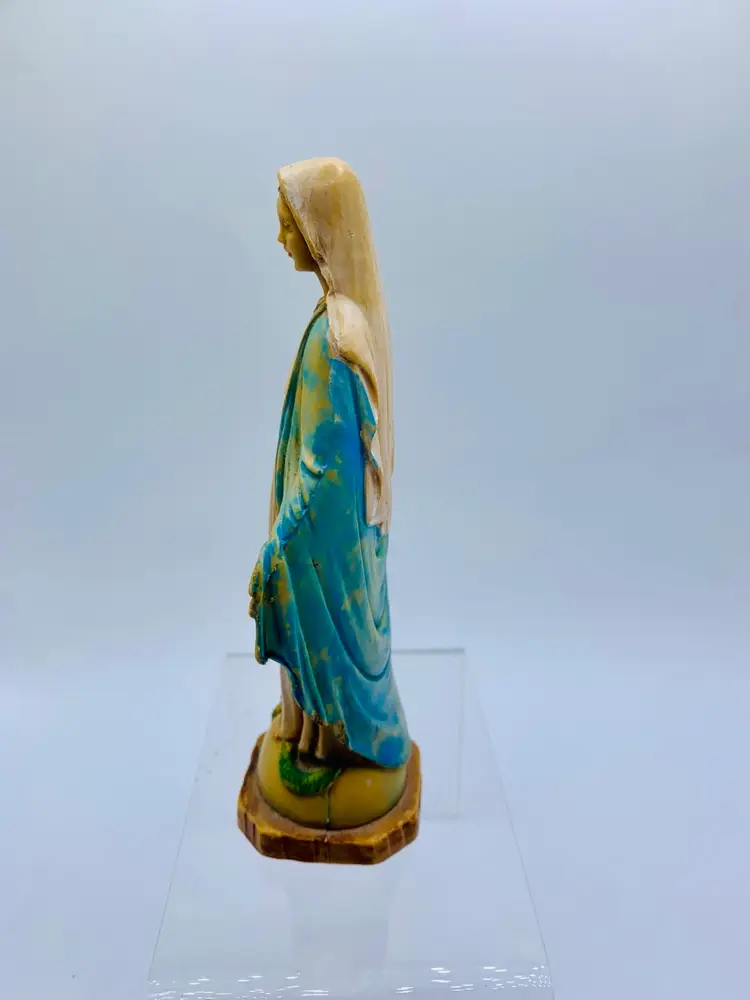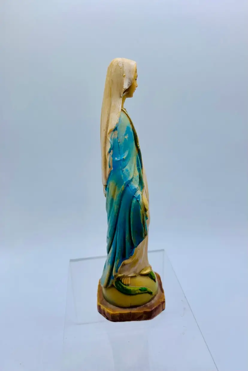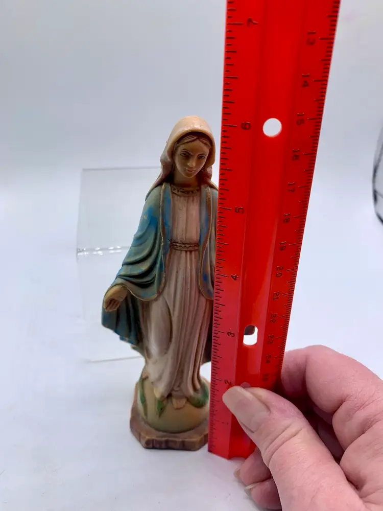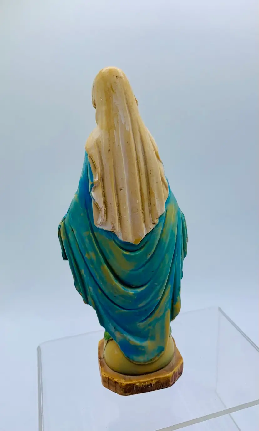 This product is a 6" resin figurine of the Virgin Mary, handmade in Italy. The detailed figure is a representation of the Virgin Mary and is crafted with care and precision. The use of high-quality resin material ensures durability and longevity of this religious figurine, making it a beautiful and meaningful piece for collectors or those seeking a devotional item for their home. Made with faith and attention to detail, this figurine embodies the spirit of Christianity and is a treasured piece for those who appreciate religious art.