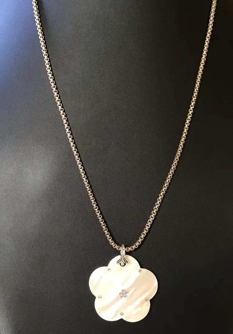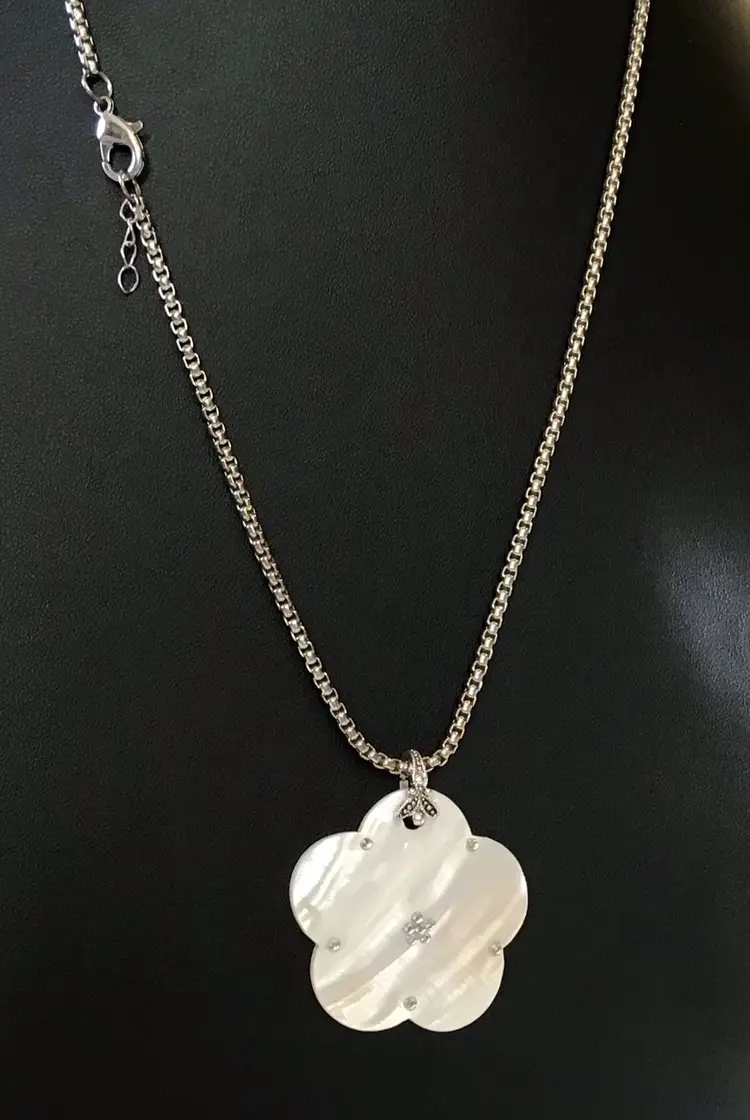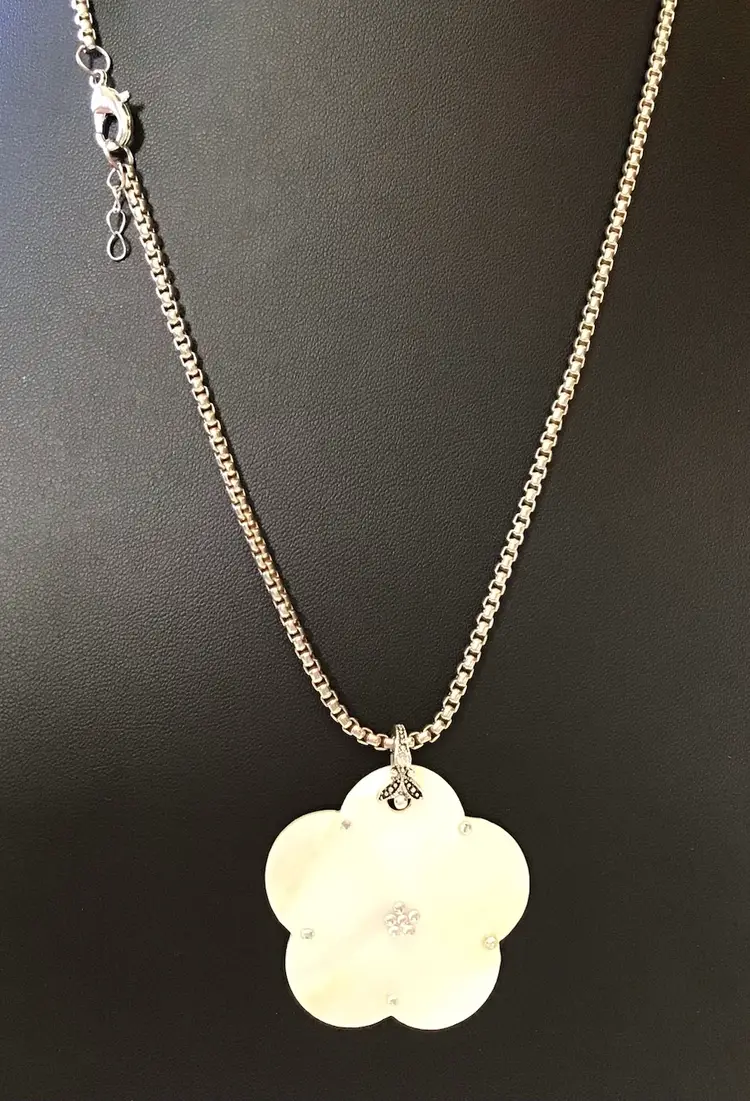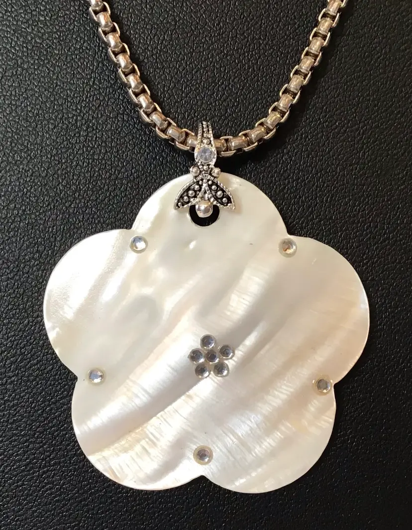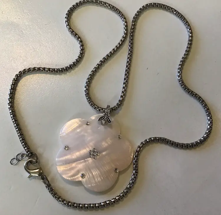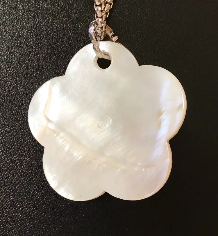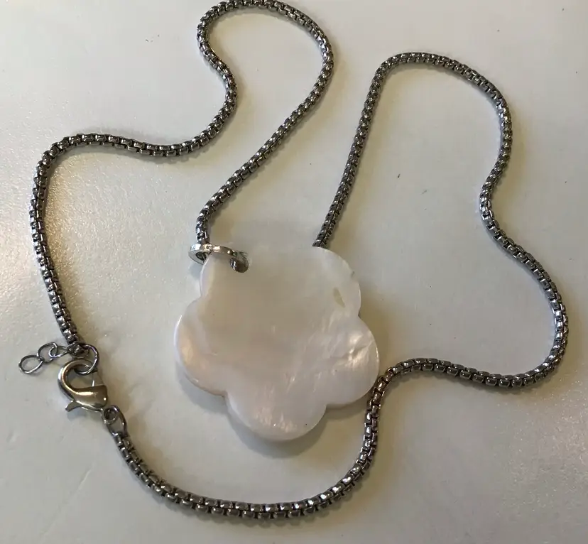 MOP pendant on silver tone 25” aire box chain with lobster clasp. #638