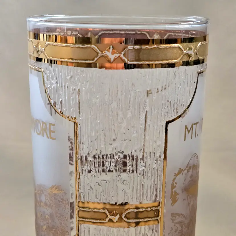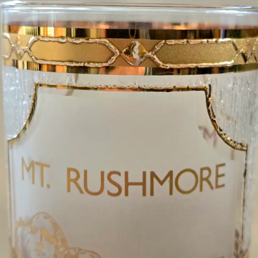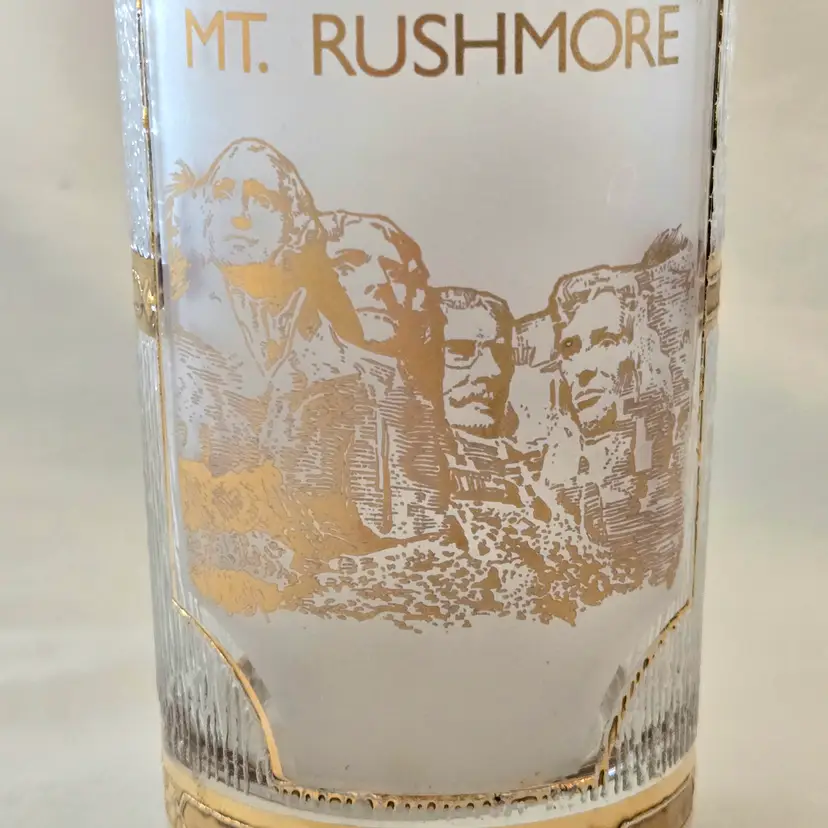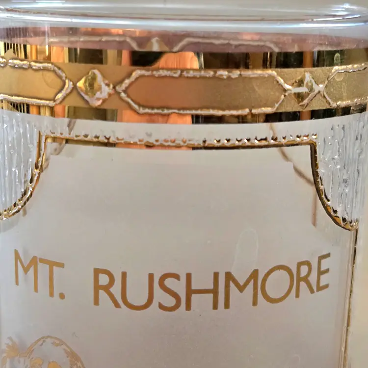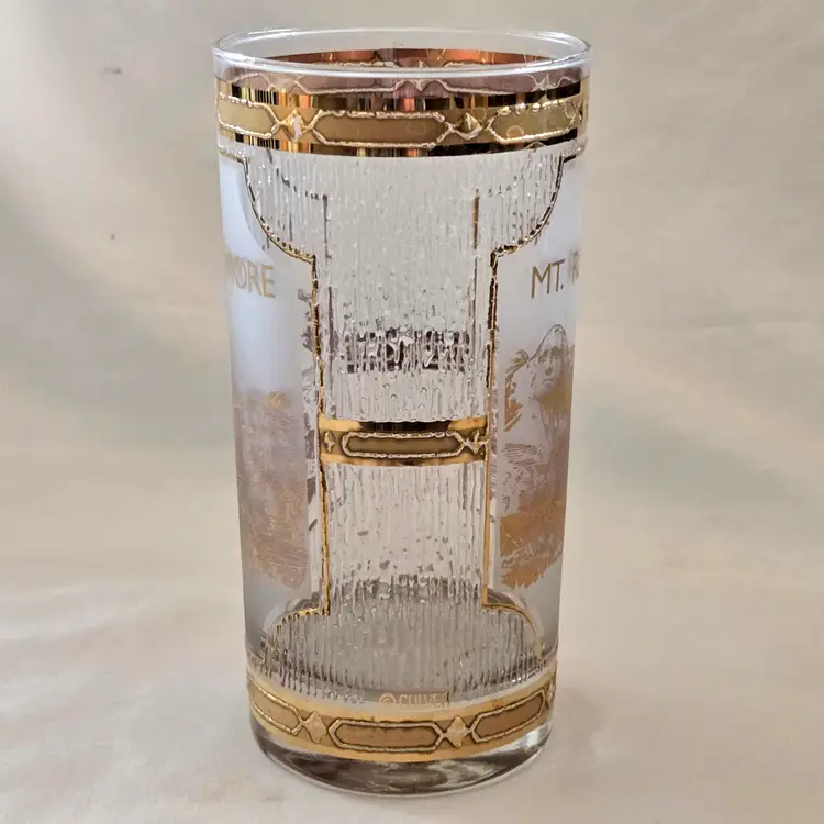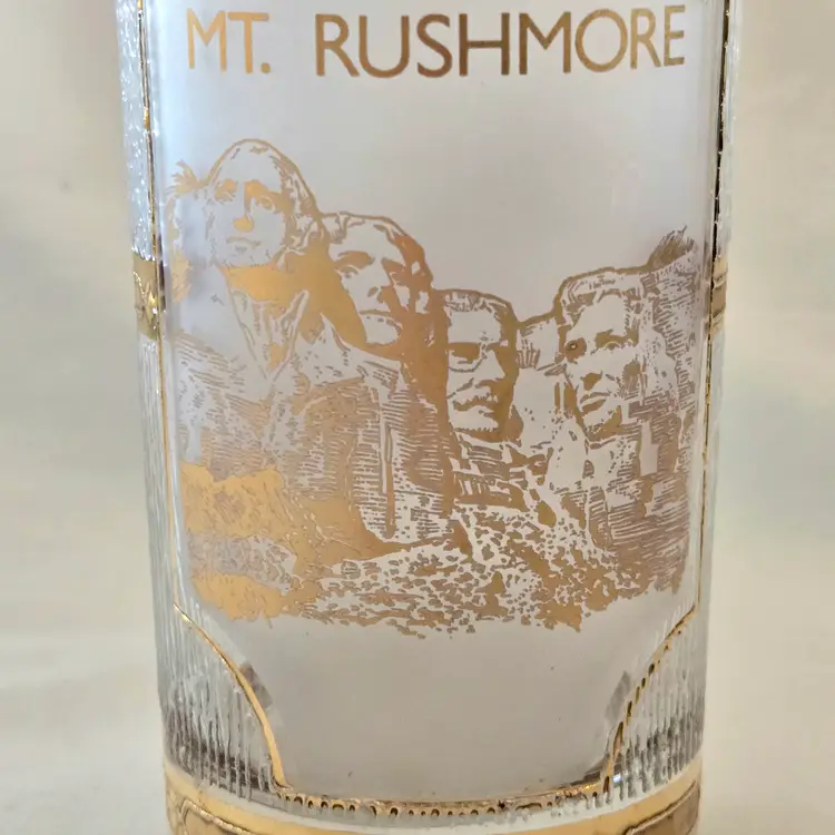 Mount Rushmore Souvenir CULVER Glass 22K Gold Trim Old Fashion Glass with Printed Logo & Condition Issues Vintage. Both buff and textured exterior. Used condition with some of the gold having worn off from handling, scrapes, scratches and a bit of dirt from handling. Please view all the photos and please ask any questions prior to purchase when possible.