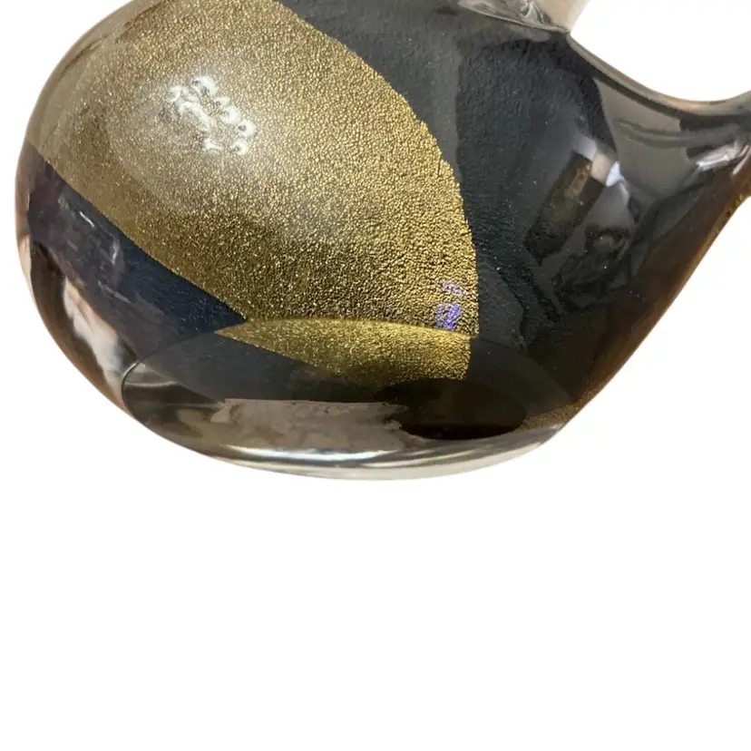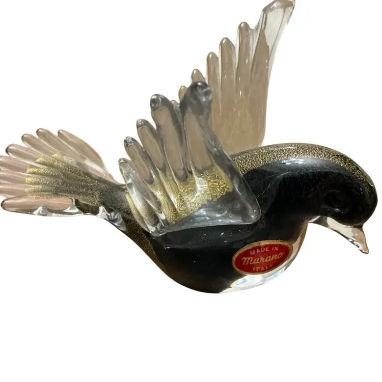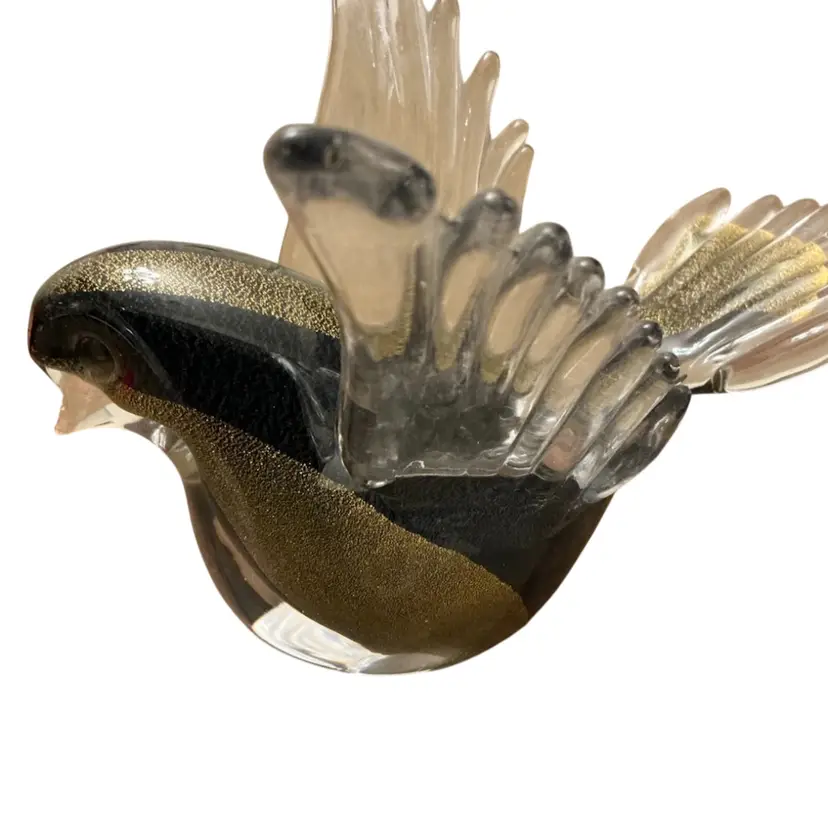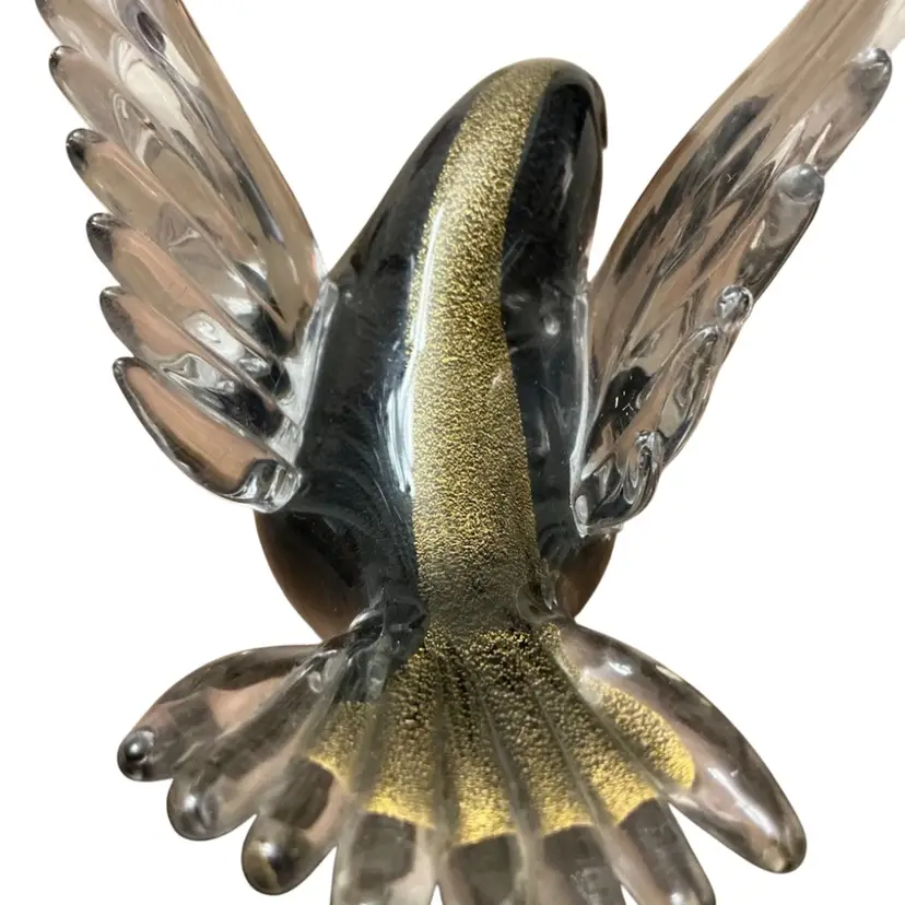 Gorgeous Murano clear and gold adventurine glass bird figure. Original stickers are in tack. Perfect condition no chips or other surface issues. This one measures 5” by 4.”