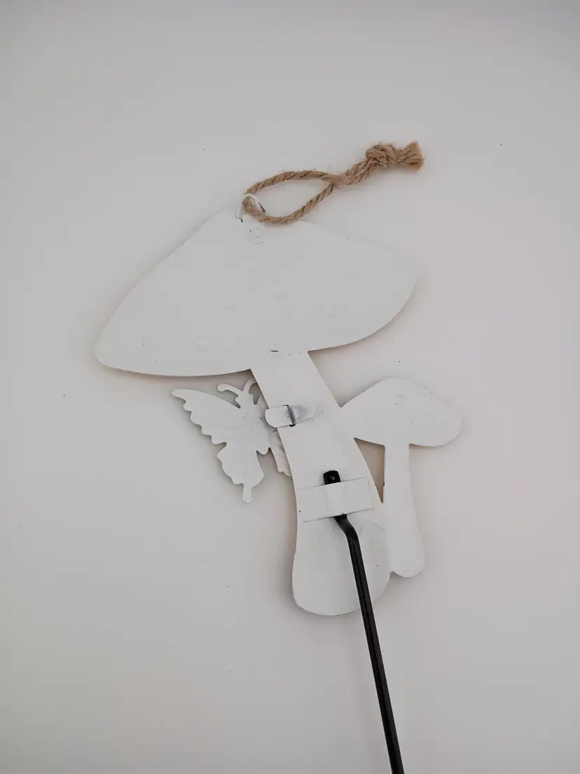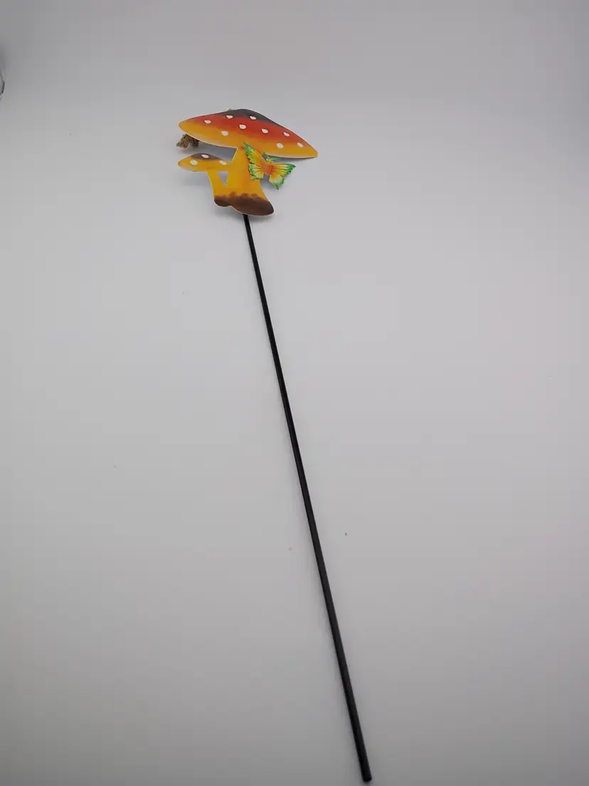 It's an adorable metal mushroom and butterfly stake. It also has a loop for hanging and is in excellent condition with no rust or color loss. 18" long