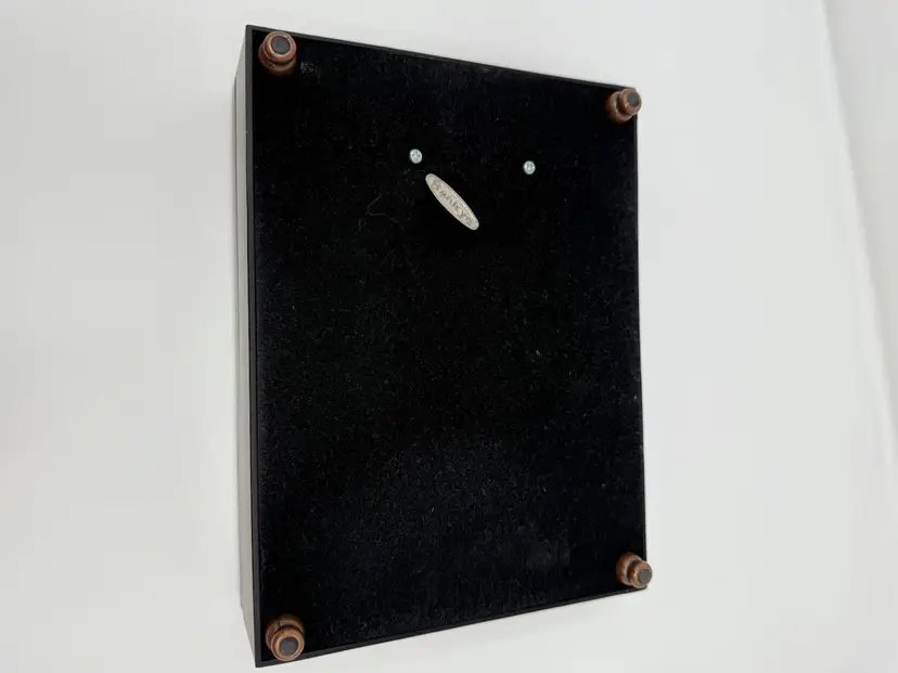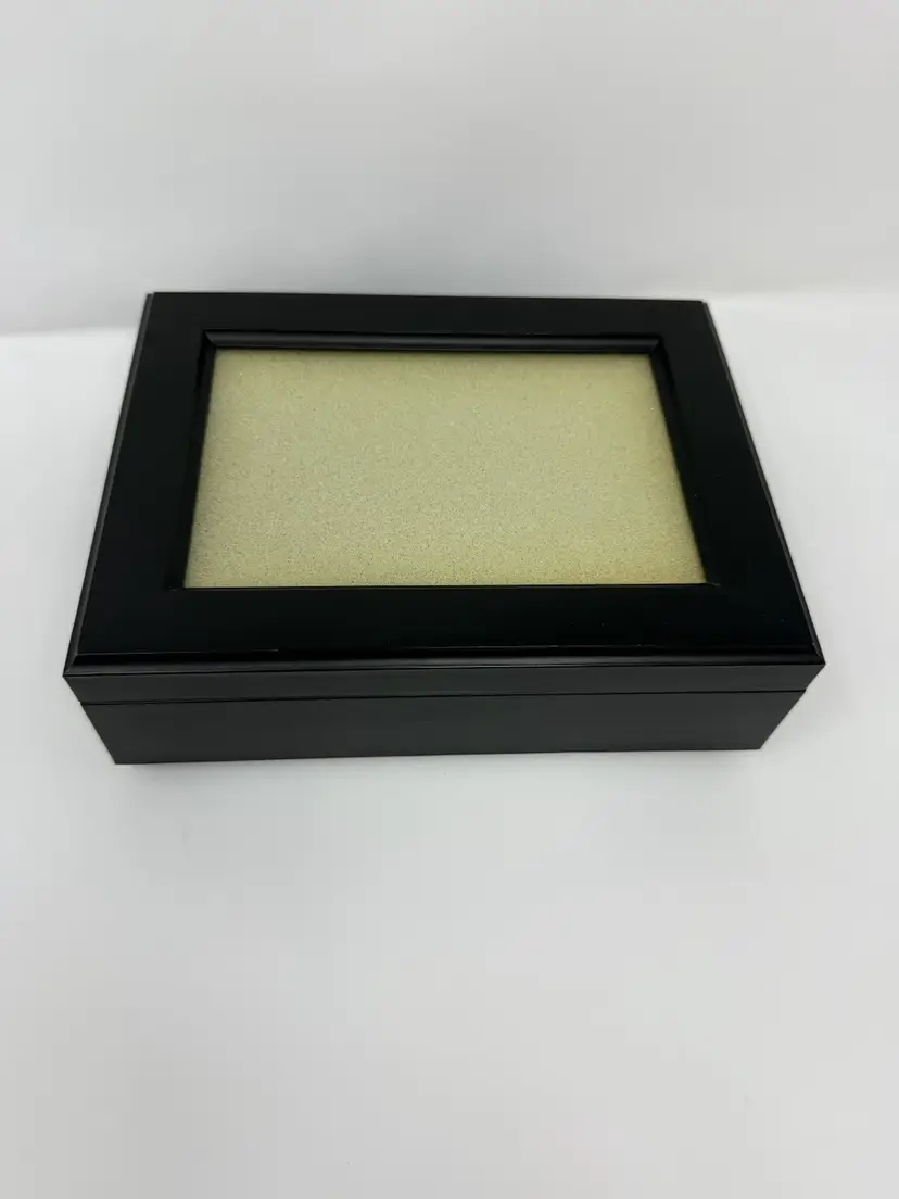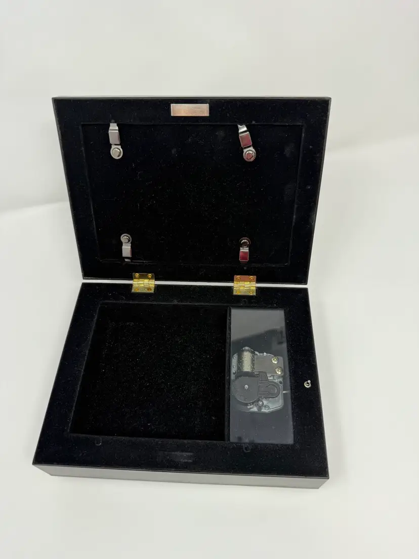 Black box with a photo frame in the lid and a music box inside. Black velveteen interior. Plays Amazing Grace. Good condition. Box 8 x 6 x2” Frame 4x6”