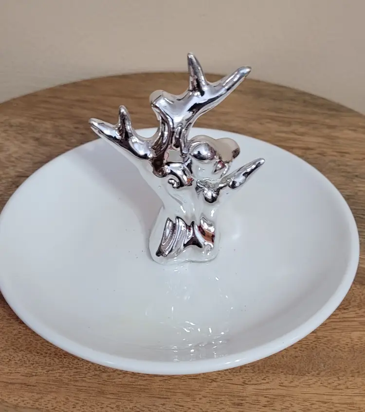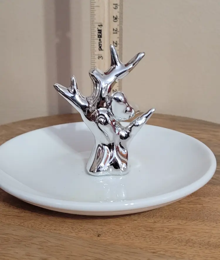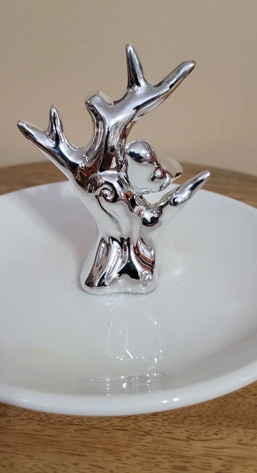 New in Box Jewelry Dish With Silver Bird on Branch 6" dish x 3.5"