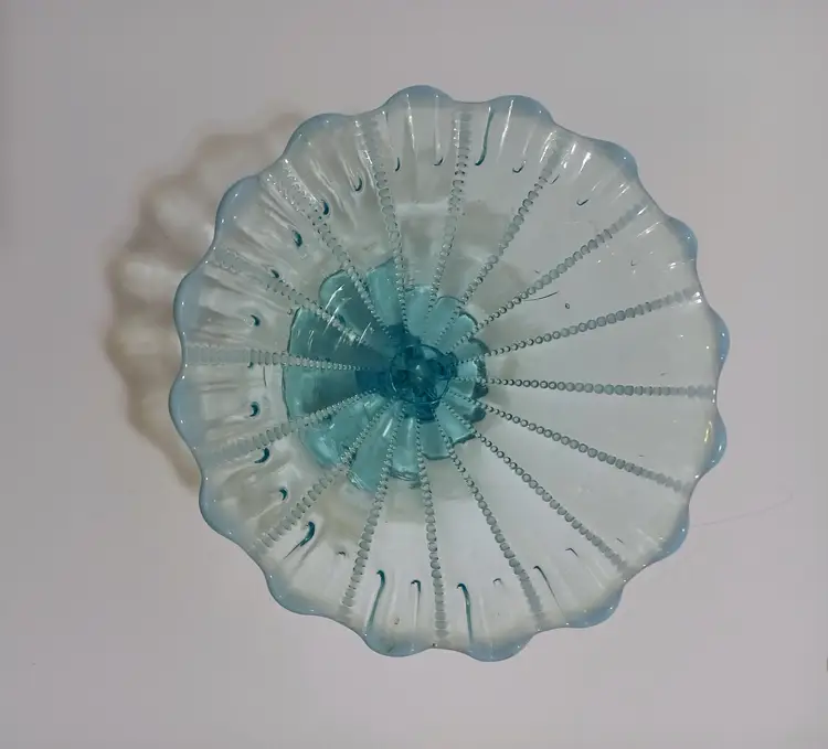 Beautiful! Vtg Northwood Blue Opalescent Beaded Panel Ruffled Open Compote Footed; Very Nice Condition! 4" T x 6.5" W x 3.5" D! Shows Some Wear Consistent with Age. A Gorgeous Addition to Any Collection!