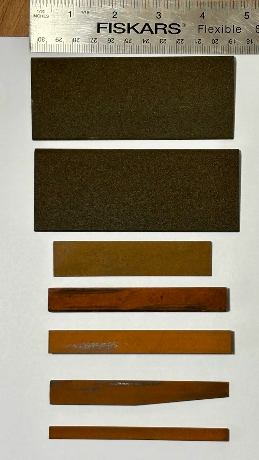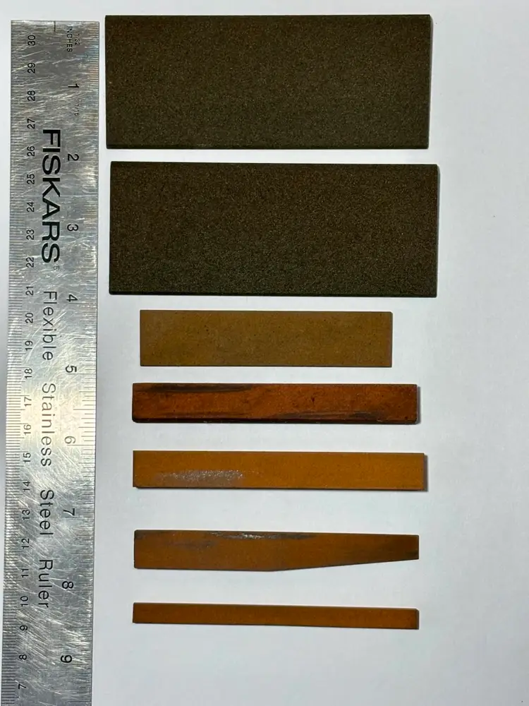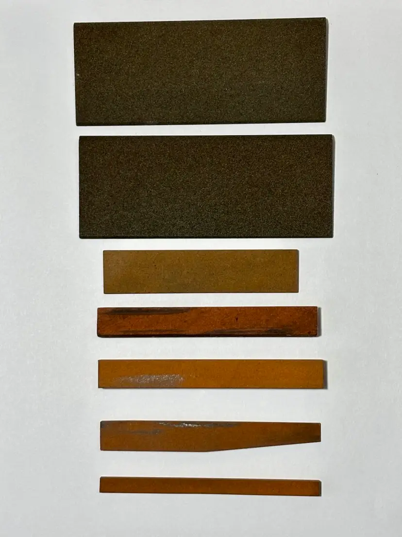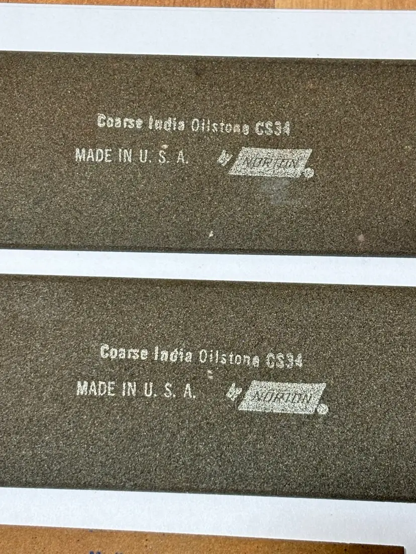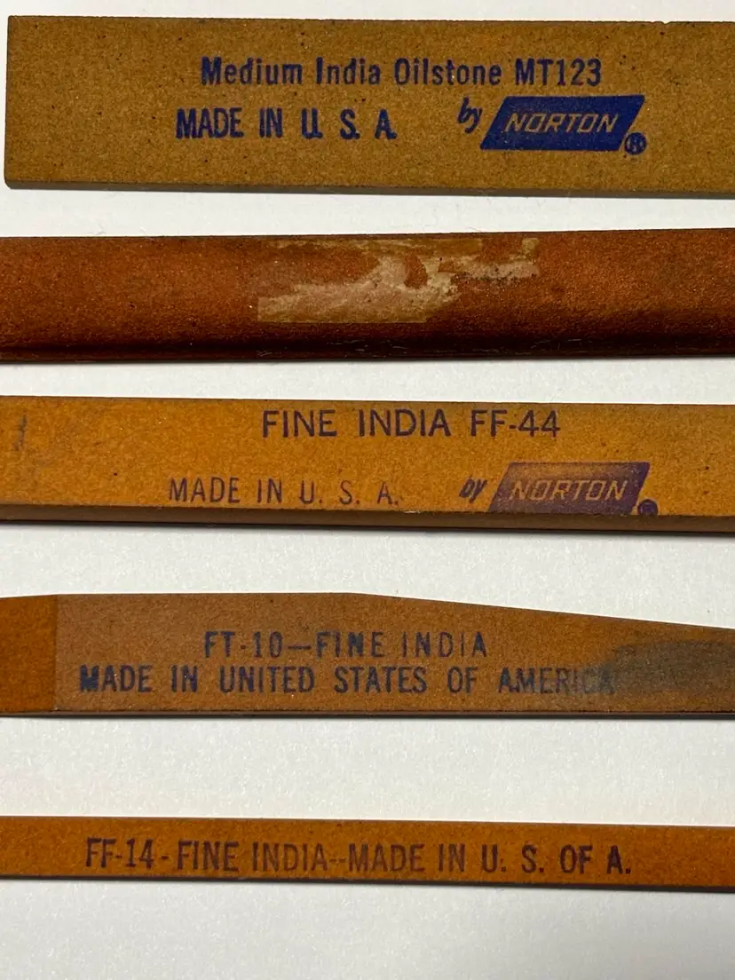 2 - Norton Coarse India Oilstone No. CS34 Tapered Round Profile 1 - Norton Medium India Oilstone No. MT123 Tapered Square Profile 1 - Unmarked Half Round Profile 1 - Norton Fine India No. FF-44 Straight Rectangle Profile 1 - Norton Fine India No. FT-10 Tapered Angled Profile 1 - Norton Fine India No. FF-14 Narrow Square Profile
