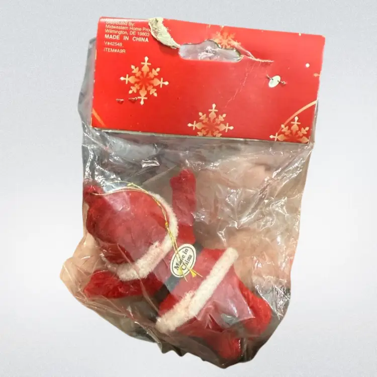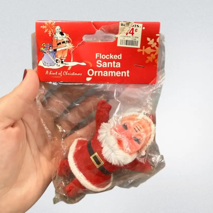 New old stock flocked Santa ornament, about 3.25in tall. Packaging is a little beat up but it’s never been opened!