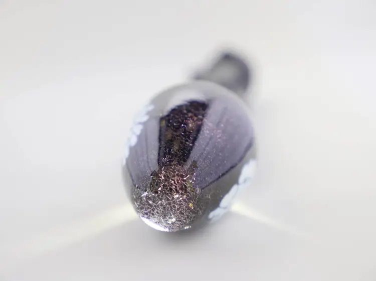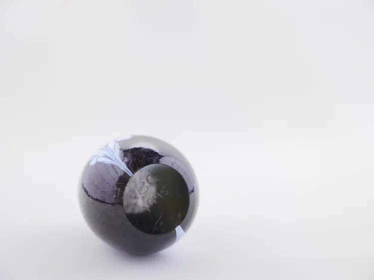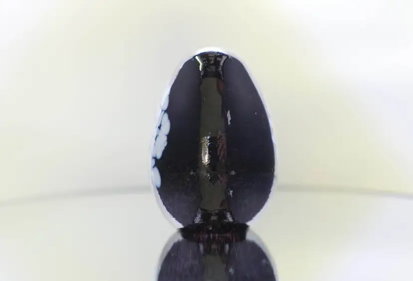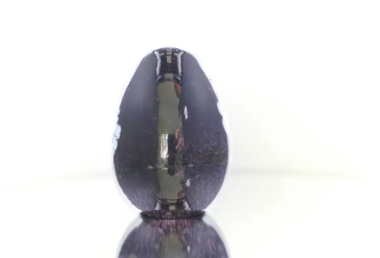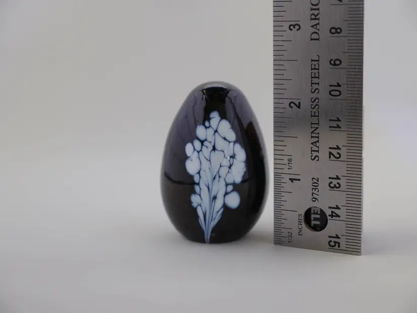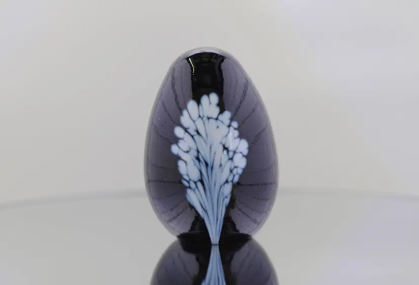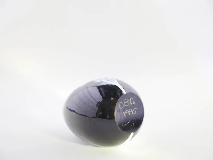 A solid, egg-shaped art glass paperweight. The exterior is a very dark, opaque purple, appearing almost black, with a polished finish. The exterior features two white floral-like motifs rising from the base. The bottom is flat and etched with the initials "OBG" and the year "1995." This small paperweight stands approx. 2.25" tall by 1.5" wide.