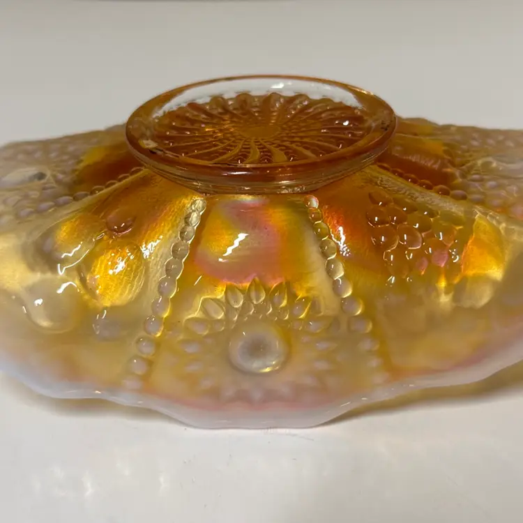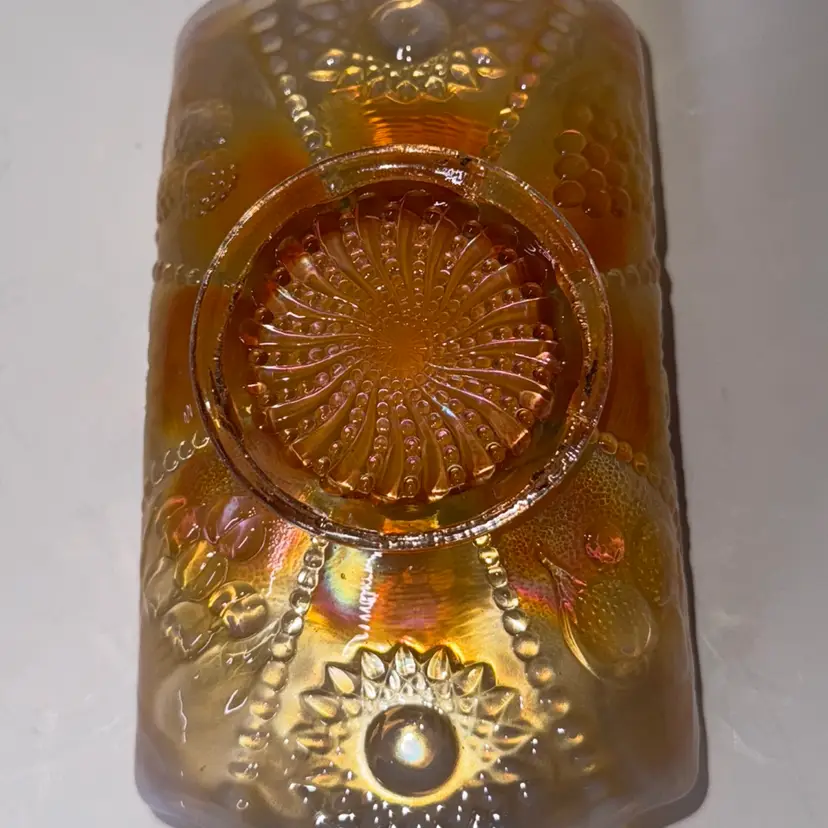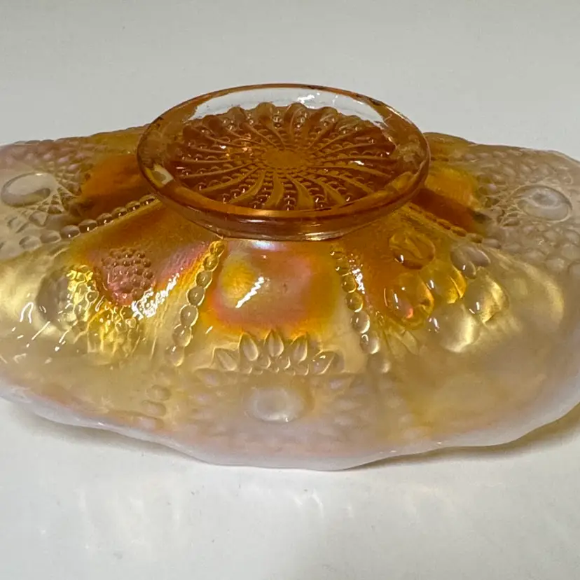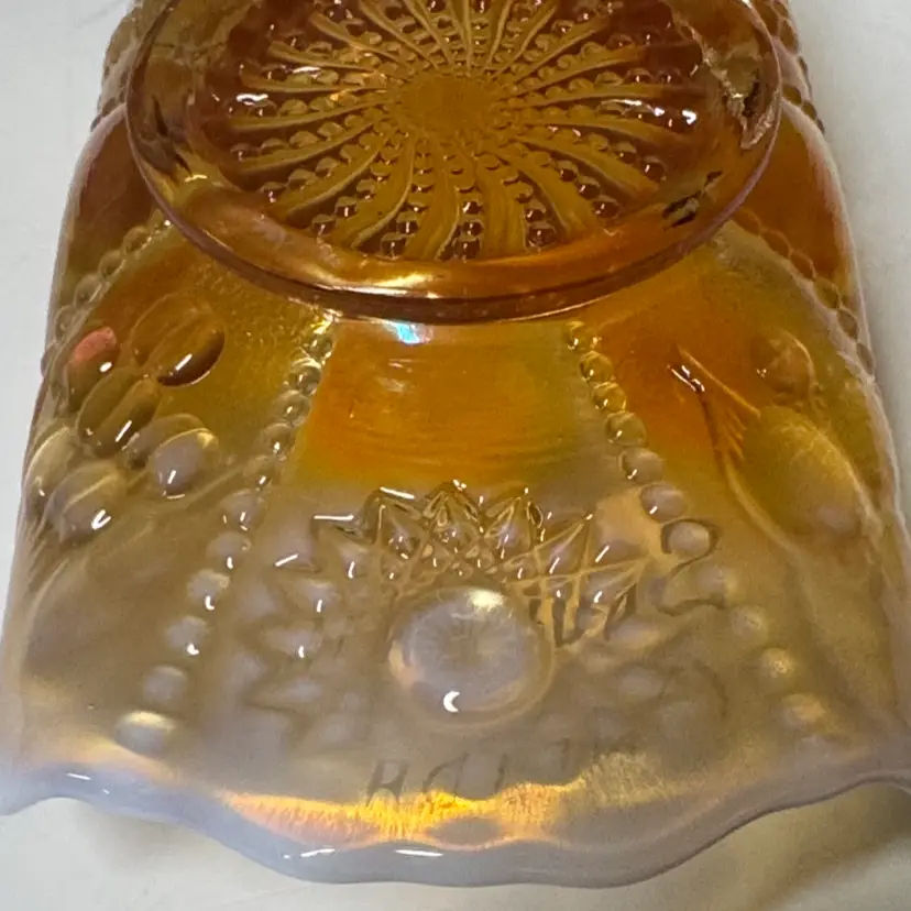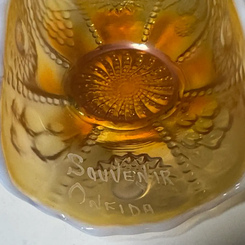 Elegant amber glass bowl by Oneida. Features intricate design. Ideal for display or serving. Oneida Amber Glass Souvenir Bowl Carnival Peach Opalescent berries and sun 6” across 3.5” wide 2.25” tall Excellent condition with no breaks or chips (84123265)