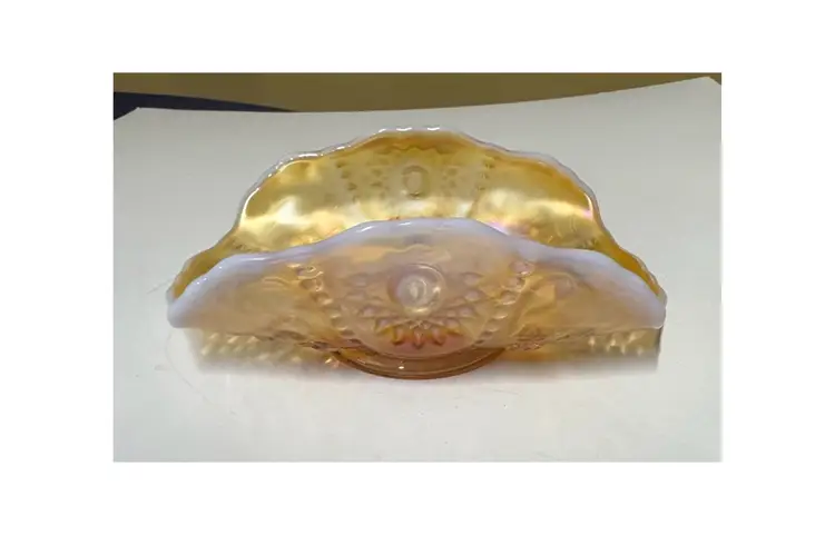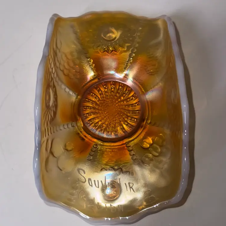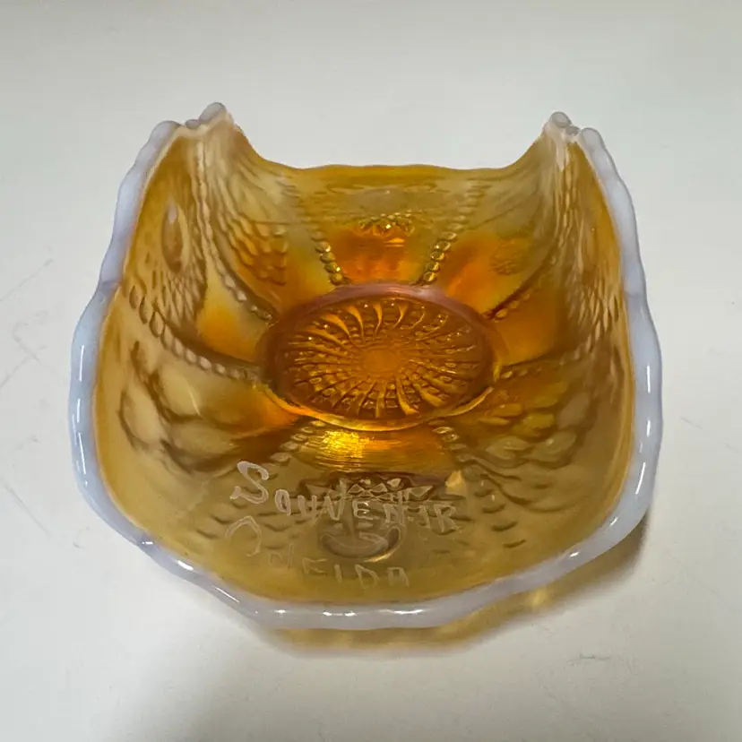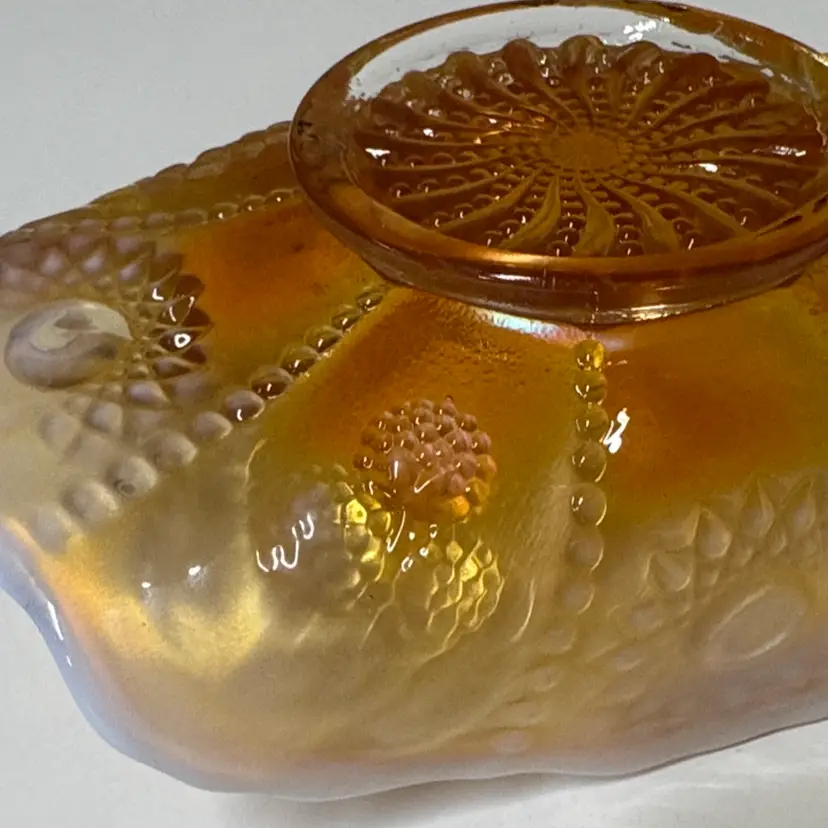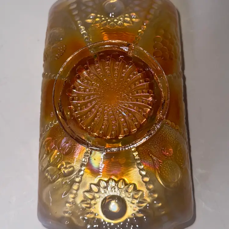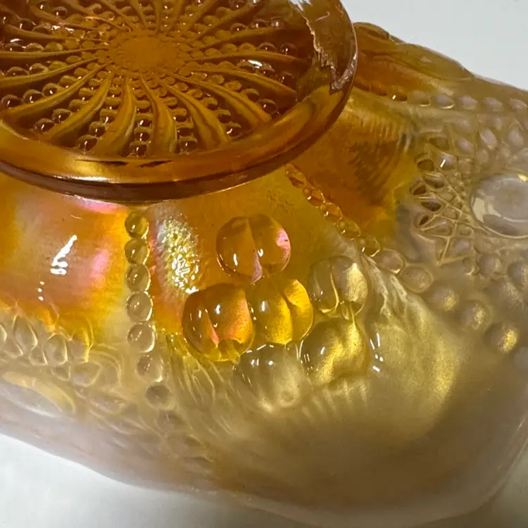 Elegant amber glass bowl by Oneida. Features intricate design. Ideal for display or serving. Oneida Amber Glass Souvenir Bowl Carnival Peach Opalescent berries and sun 6” across 3.5” wide 2.25” tall Excellent condition with no breaks or chips (84123265)
