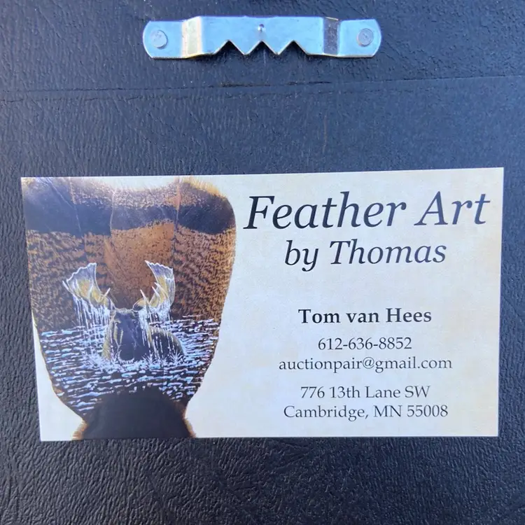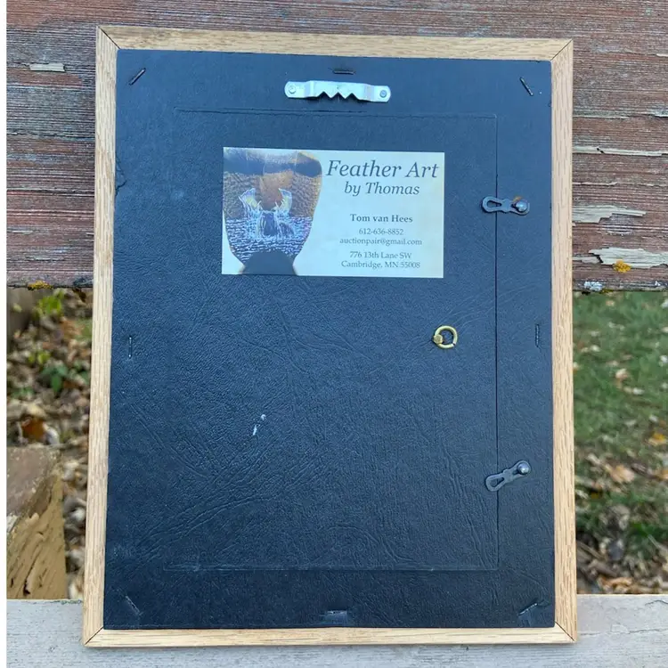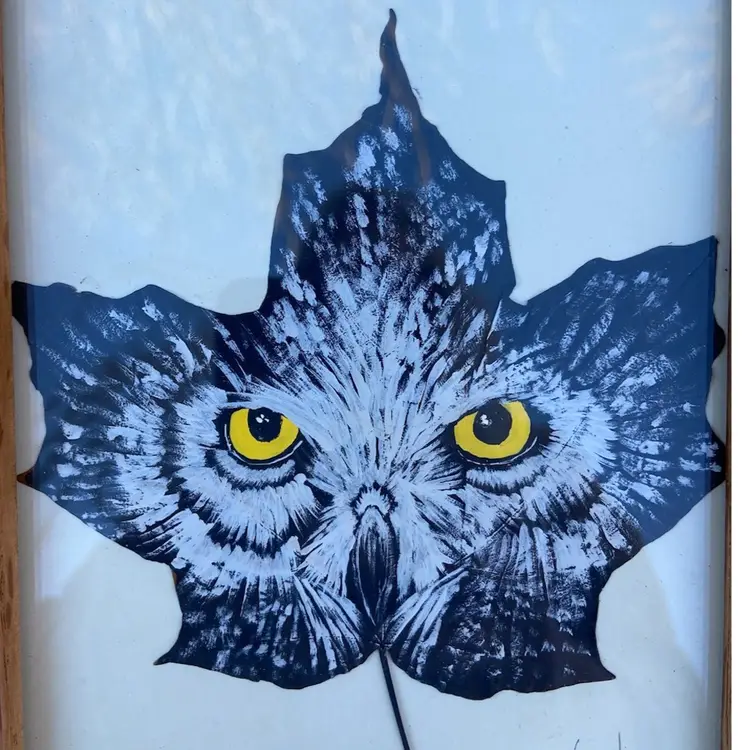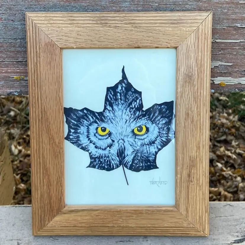 Original Owl Face Painting On Leaf. Artist: Tom van Hees. Wooden Frame With Sawtooth Hanger On Back. Frame Opening: 6 9/16”h x 4 9/16”. Frame: 9 9/16”h x 7 9/16. Artist Signed.