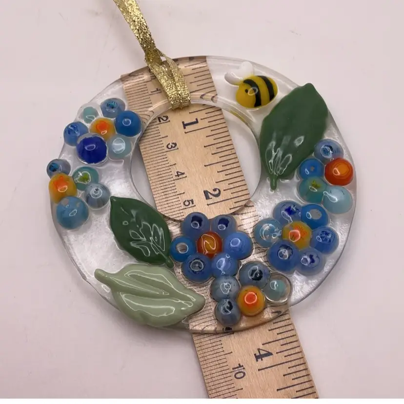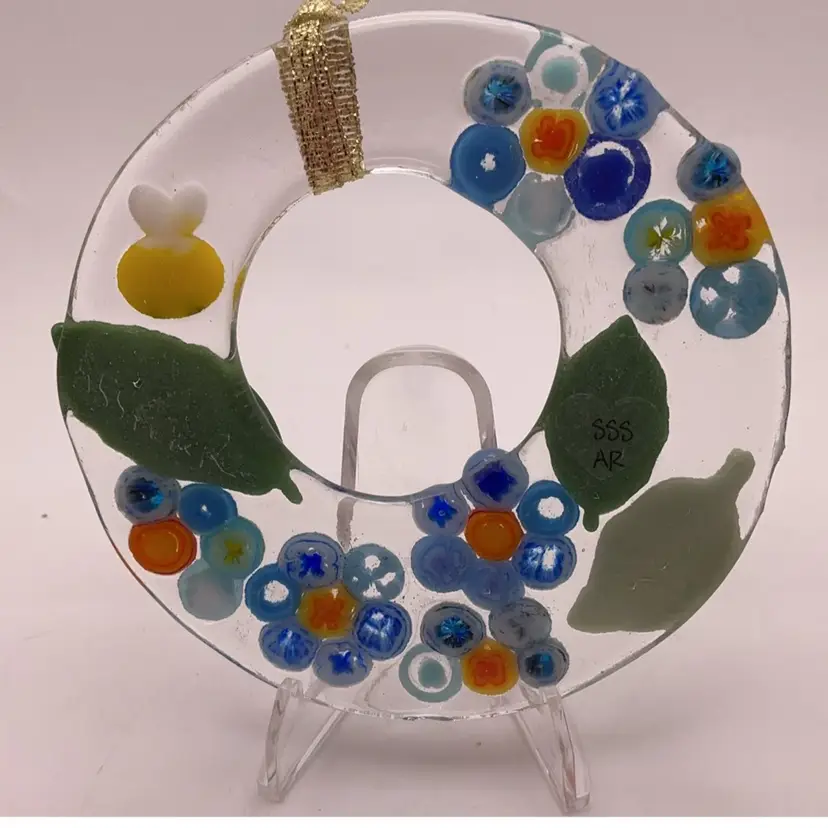 Fused glass ornament, kiln made with love by me! Each ornament is unique and varies in color placement, bubbles and depth of field. Shiny on the front, textured on the back. Made with Bullseye glass and added elements from other artists. SIGNED BY ME: SSS AleneR NOTE: Item is hand-cut, there may be some irregularities.