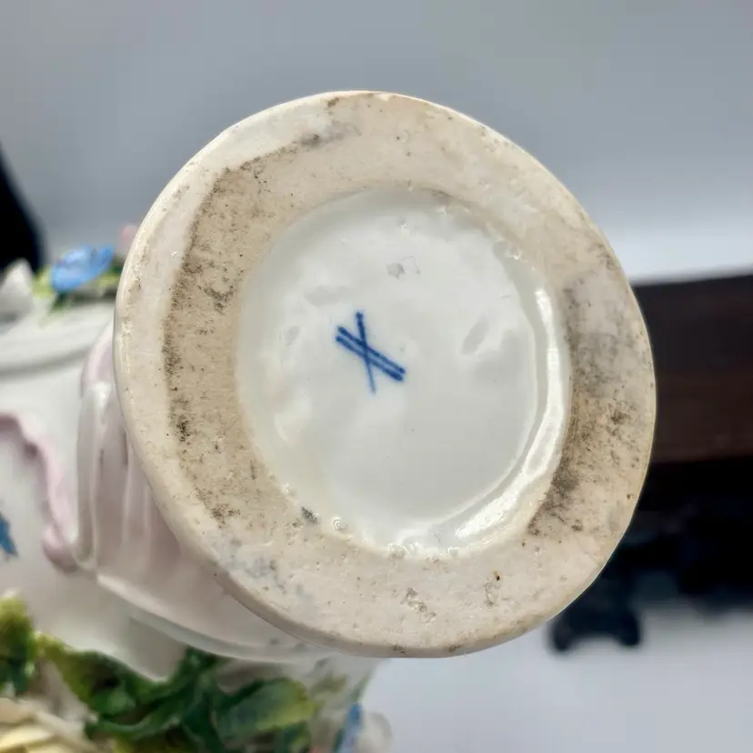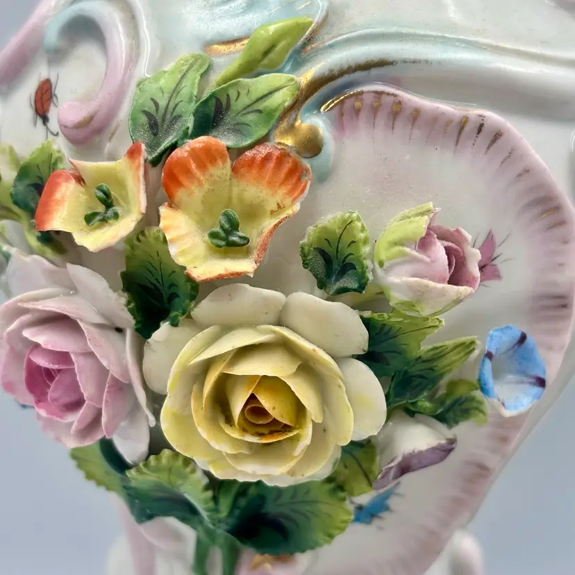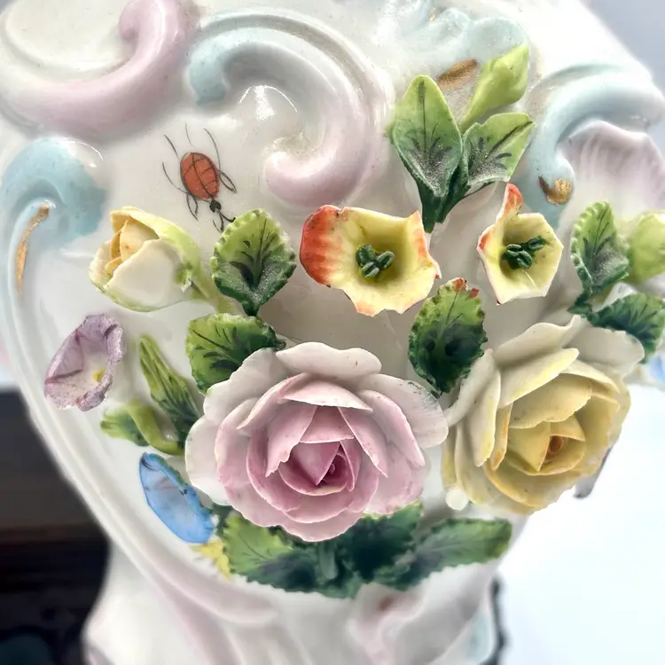 • does have some chipping on some applied flowers Lots of bugs, beetles & butterflies Beautifully made Please check makers mark on bottom as seen on photos Will ship alone and packed within an inch of its life!