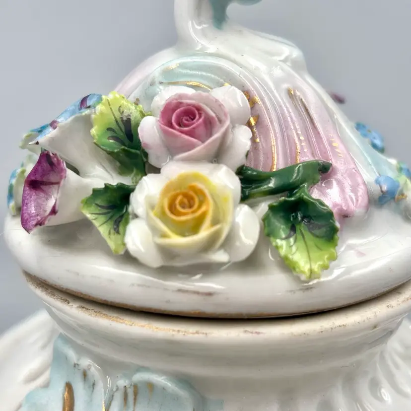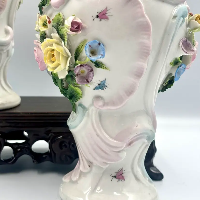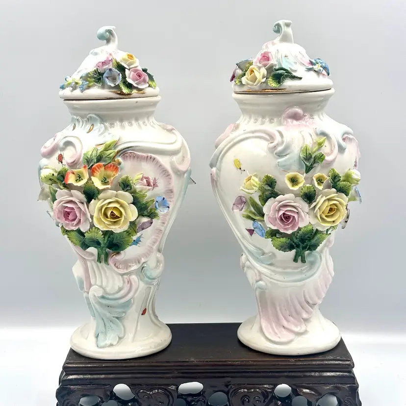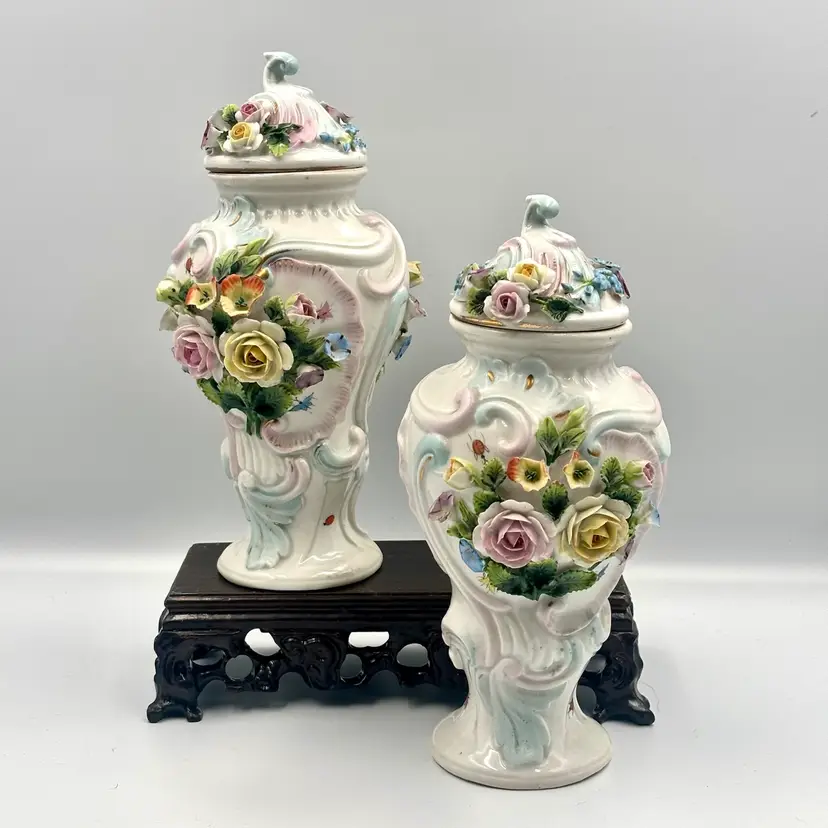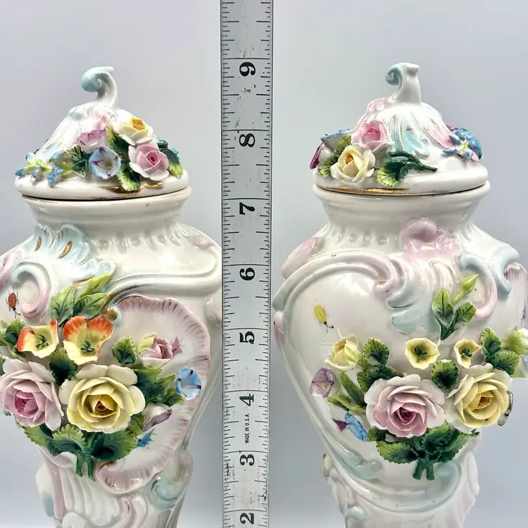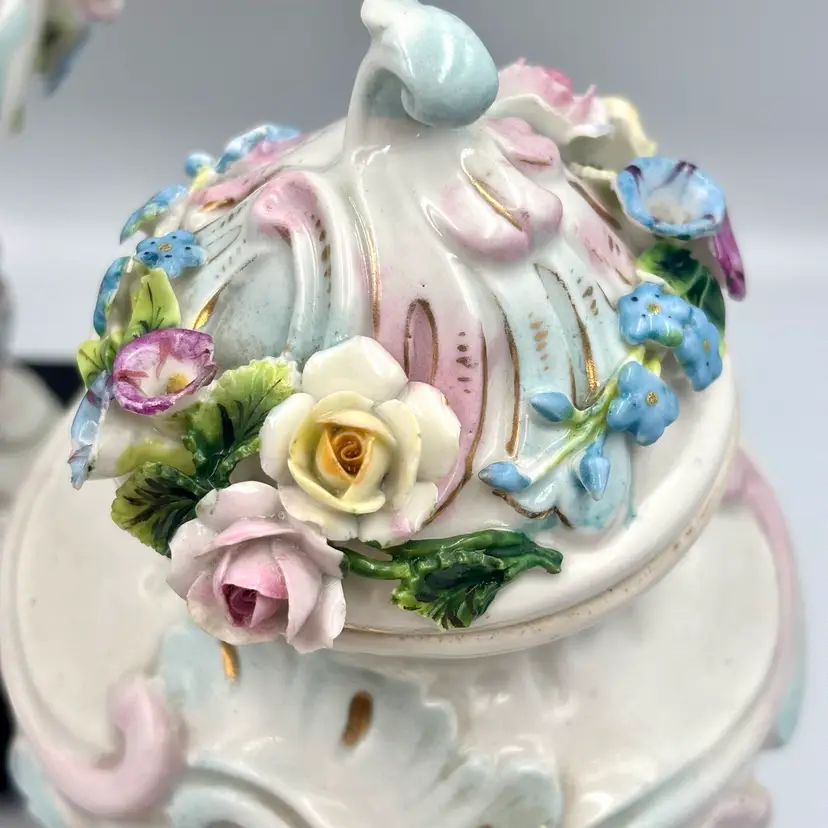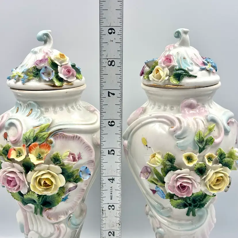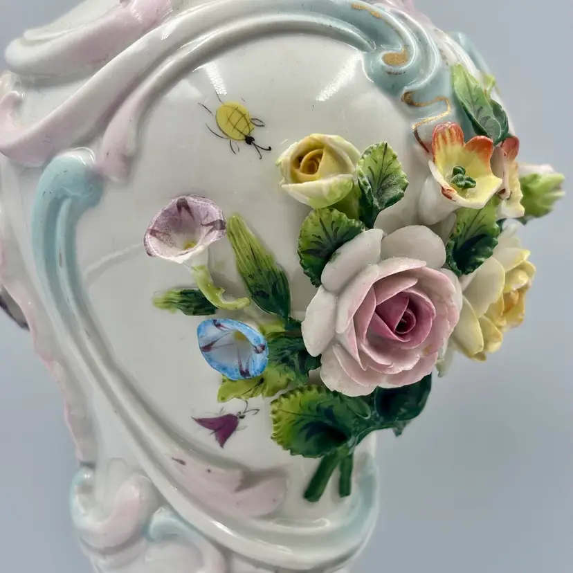 Pair of Antique Porcelain Floral & Insects Lidded Urns 9”*