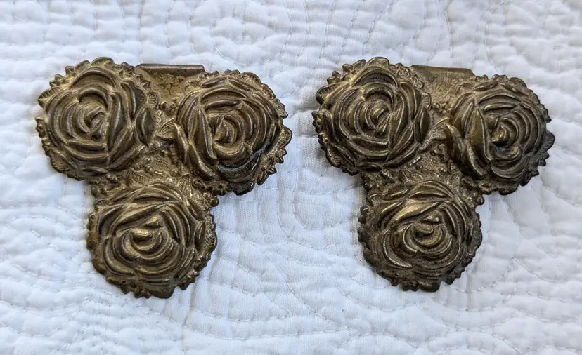 Pair of Embossed Art Nouveau Floral Dress Clips in Antique Brass Tone
