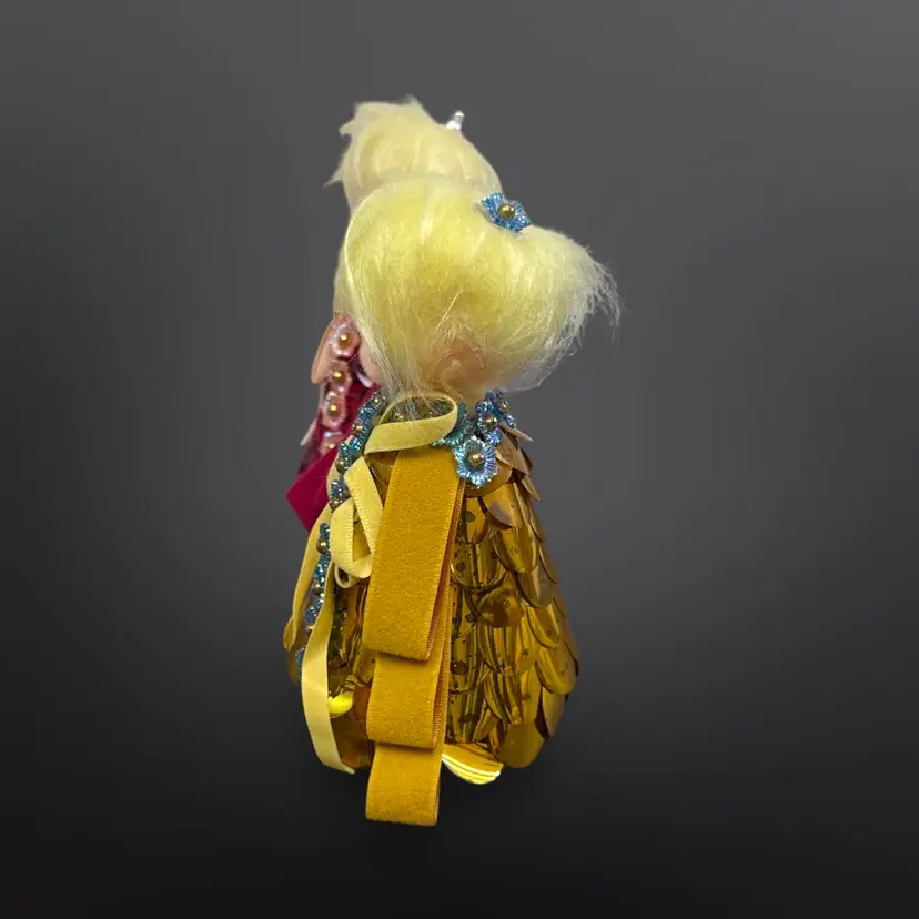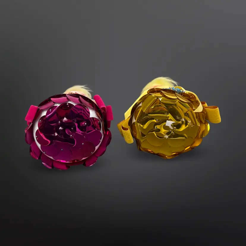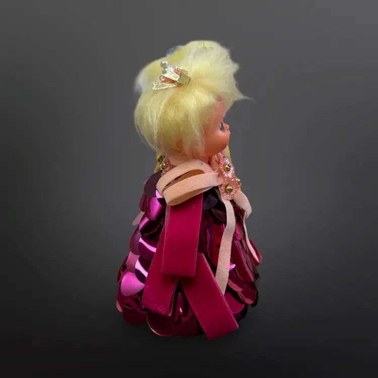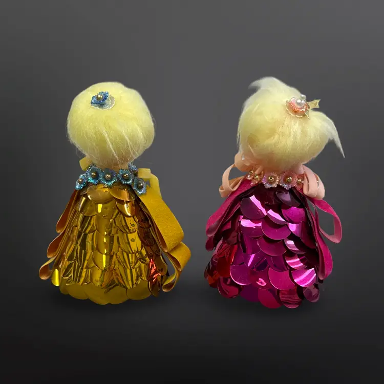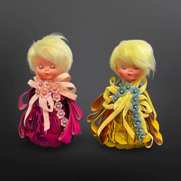 Adorable pair of kitschy sequin and flower beads girls made from kits. Good vintage condition, no major damage; some age related wear, and yellow girl has some extra glue on her face.