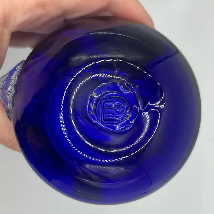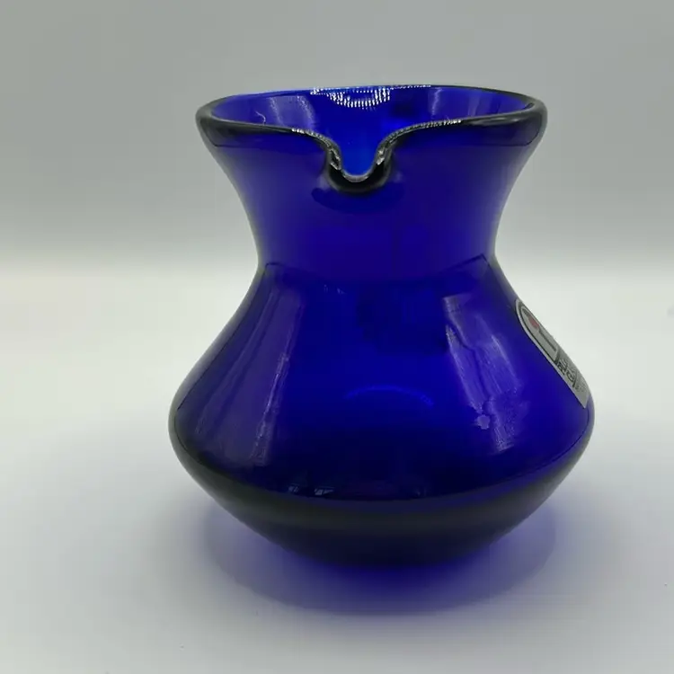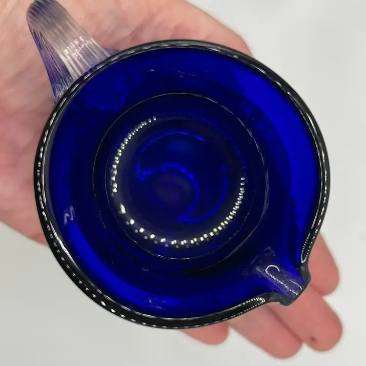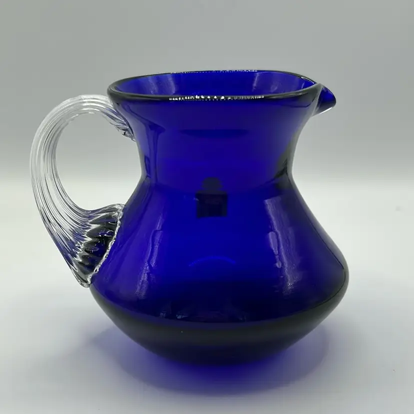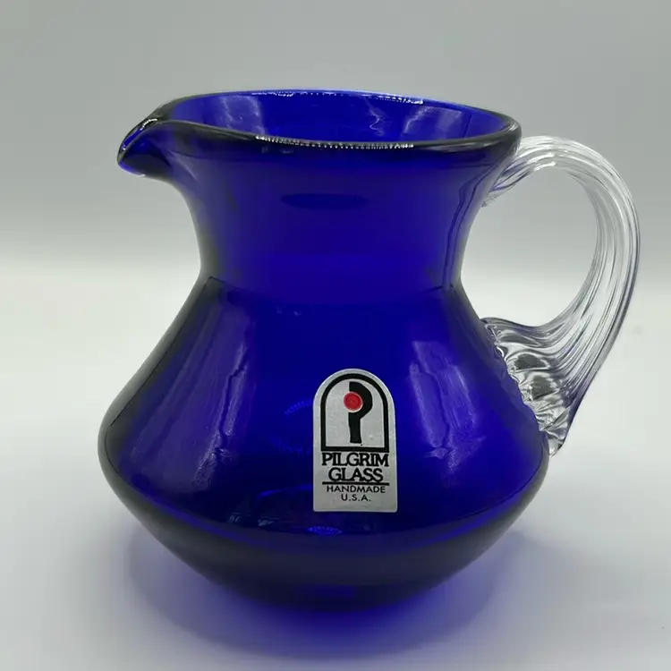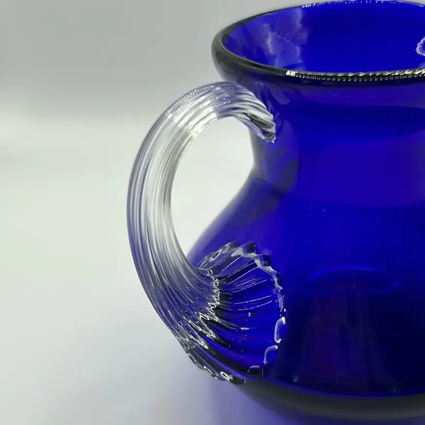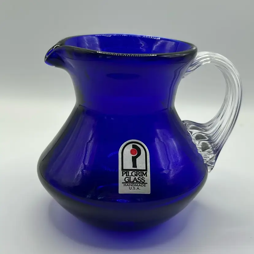 This piece is a vintage hand blown cobalt blue glass pitcher with a clear ribbed handle made by the pilgrim glass company it stands just over 3 inches tall and 3 inches across there are no chips or cracks