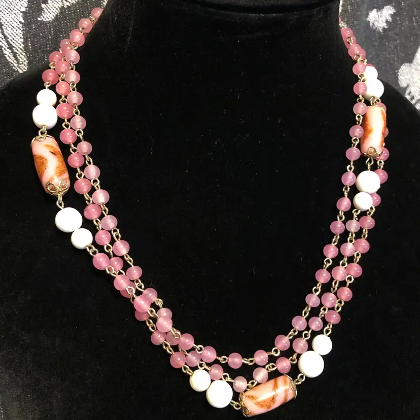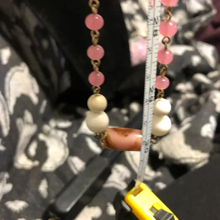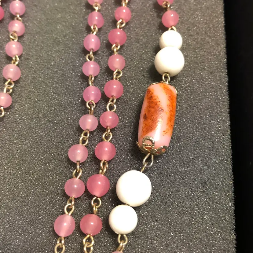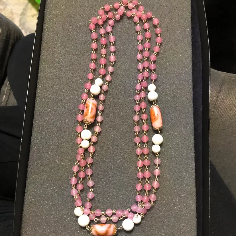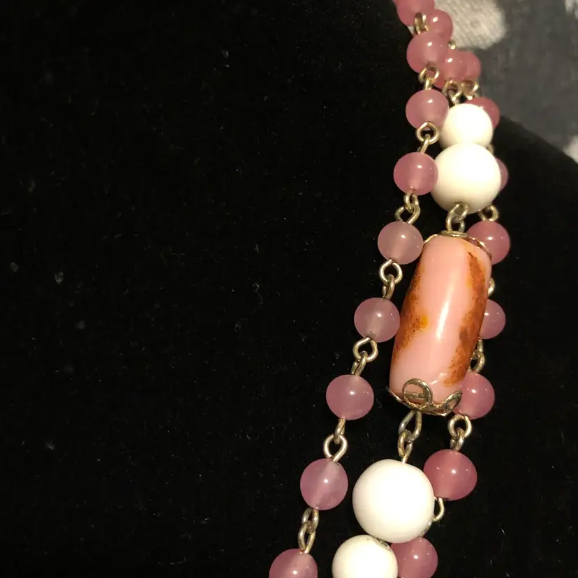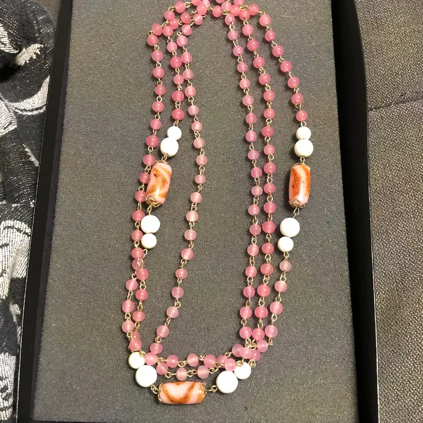 Absolutely stunning Has different beads About 30 inches in length so 60 in total length . Doesn’t have a clasp