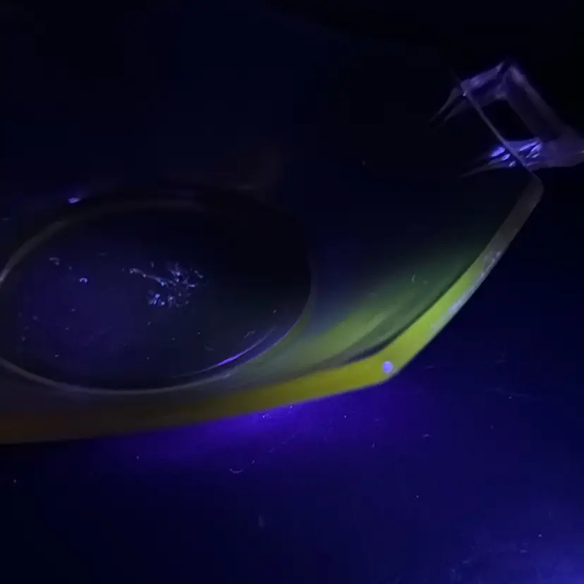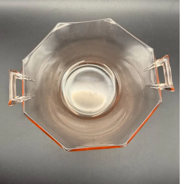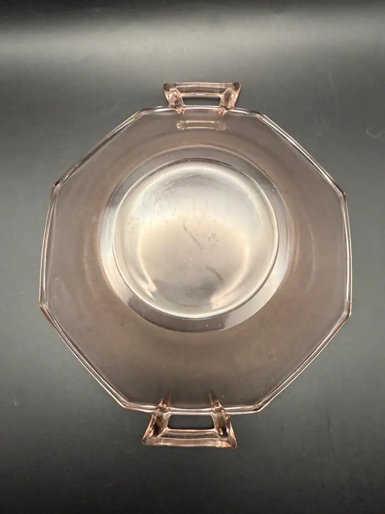 This simply beautiful pink bowl with elegant handles is 6 in in diameter and 1 1/2 in high. It glows green under UV light which makes it from the 1930s or earlier.