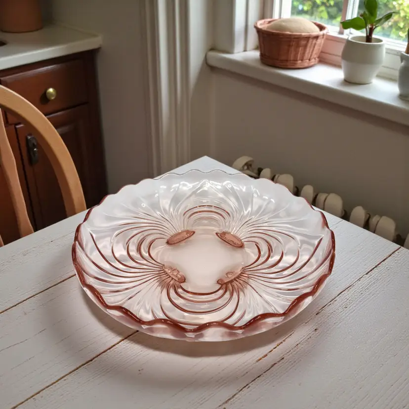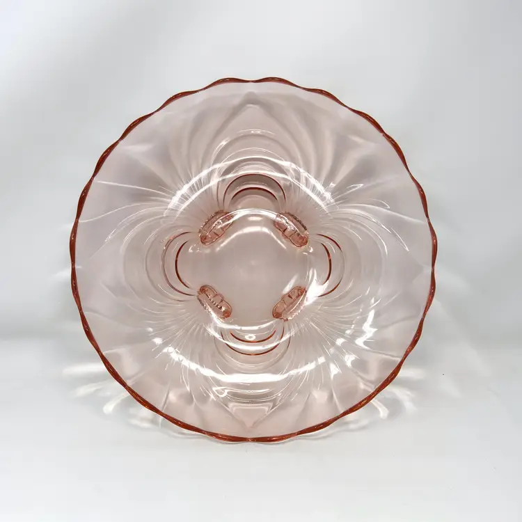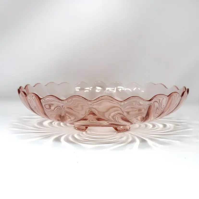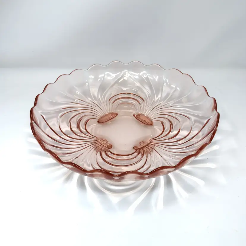 This exquisite pink glass console bowl from the Cambridge Glass Company captures the refined glamour of 1930s American glassmaking. Known for their Caprice line, Cambridge produced this pattern between the early 1930s and 1950s, making it one of their most enduring and beloved designs. The swirl-molded surface dances with light, while the four delicately arched feet elevate the dish with both function and grace.