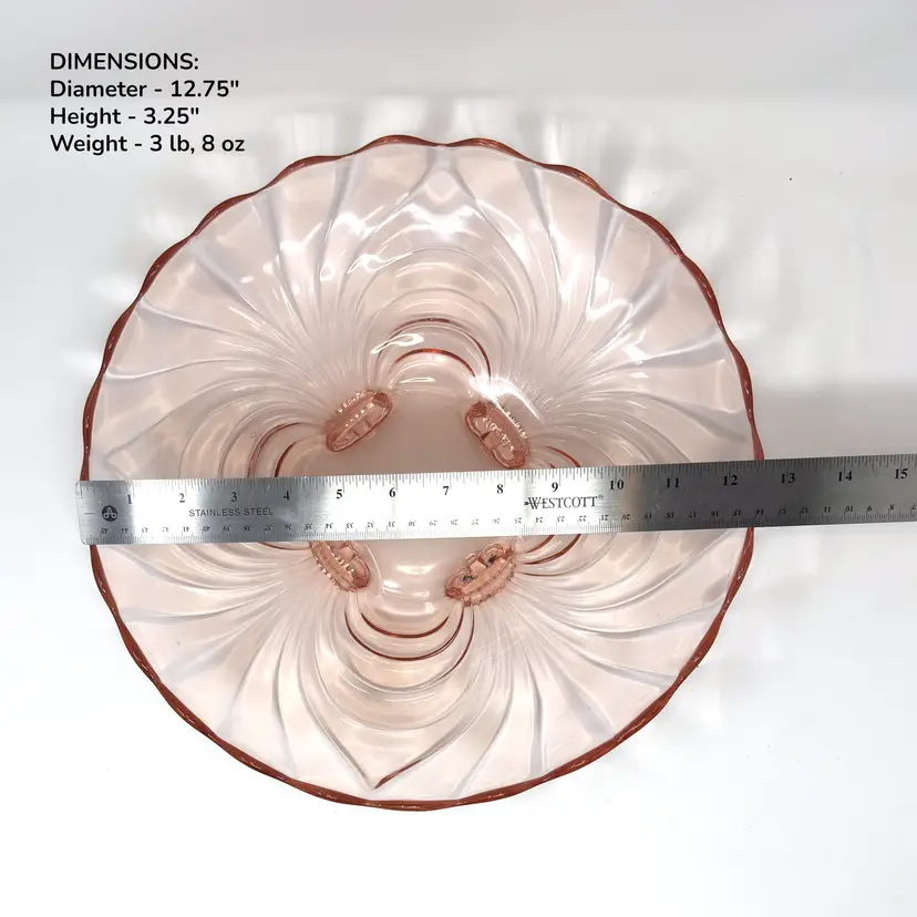 DETAILS: • Manufacturer: Cambridge Glass Company, Cambridge, Ohio • Markings: Unmarked, verified Caprice line • Date/Era: Circa 1930s–1940s • Design Style: Depression Glass, Classic American • Shape & Style: Round swirl-molded console bowl with 4 raised feet and scalloped rim • Material & Color: Pressed pink glass • Dimensions: 12.75" diameter x 3.25" height, Weight: 3 lb 8 oz