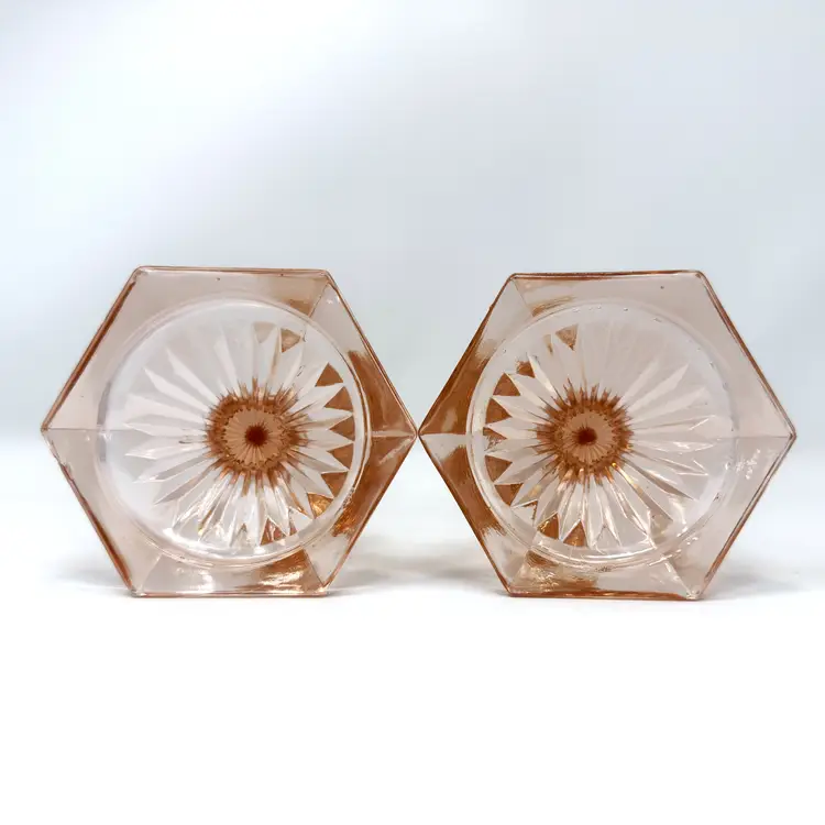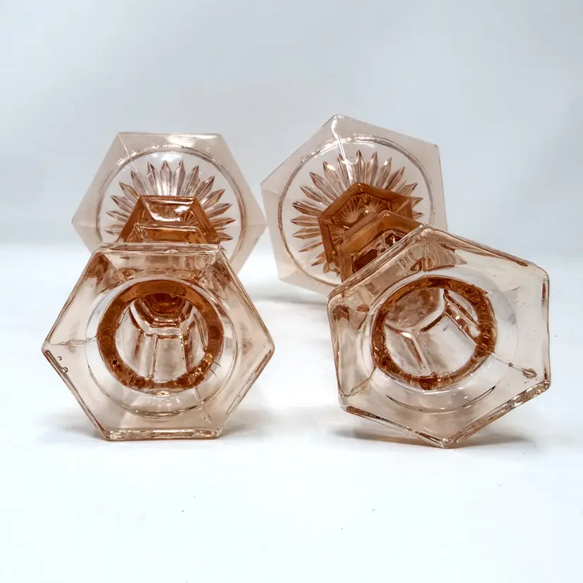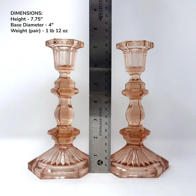 DETAILS • Manufacturer: Unknown American glass maker • Production Location: United States • Markings: Unmarked • Date/Era: Circa 1940s–1950s • Design Style: Mid-Century Traditional • Shape & Style: Faceted stems, octagonal bases, hexagonal candle cups • Material & Color: Pressed glass, blush pink • Dimensions: 7.75 in height; 4 in base diameter, Weight: 1 lb 12 oz (pair) • Condition: One holder has a small chip on the underside of the base, not visible when displayed; otherwise clean with light age wear only