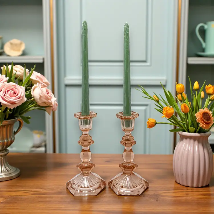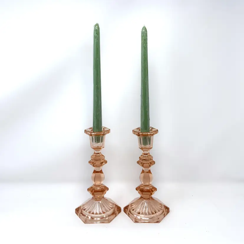 Vintage blush pink glass taper candle holder pair with faceted stems and octagonal bases, offering soft mid-century elegance for curated tabletop or mantel styling.