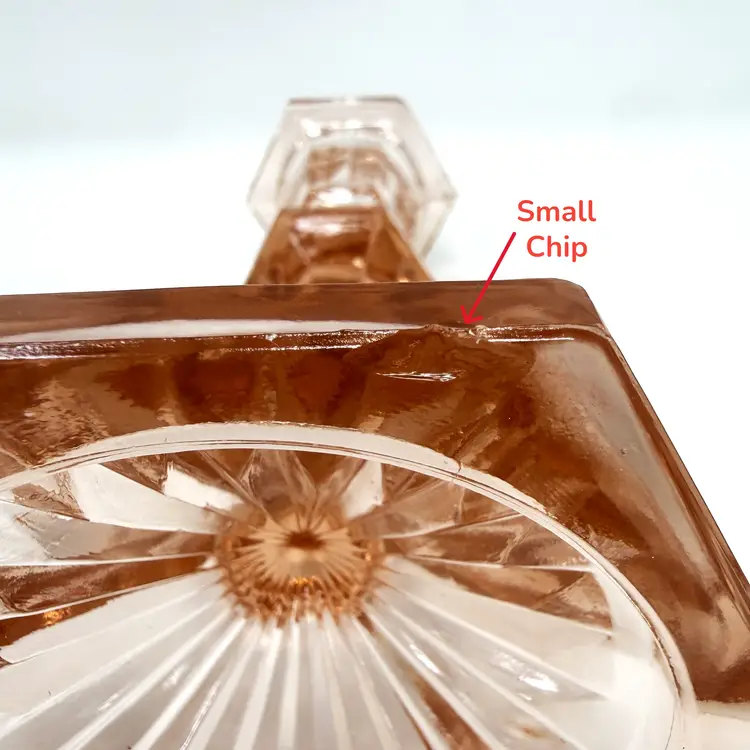 This vintage pink glass taper candle holder pair features faceted stems, octagonal bases, and a warm blush tone. One holder has a small base chip; both display classic mid-century pressed glass form.