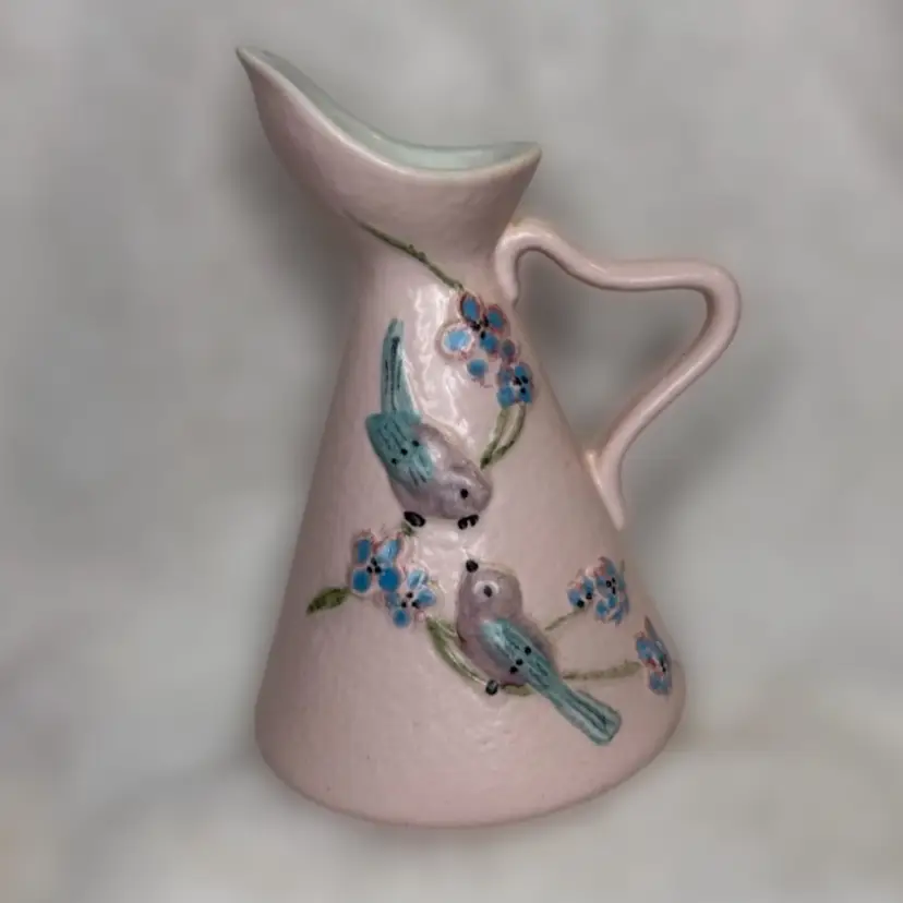 Beautiful small pink pitcher by Hull in 1957. Cute birds on both sides. 6.5” x 4”, no chips or cracks