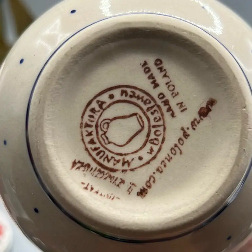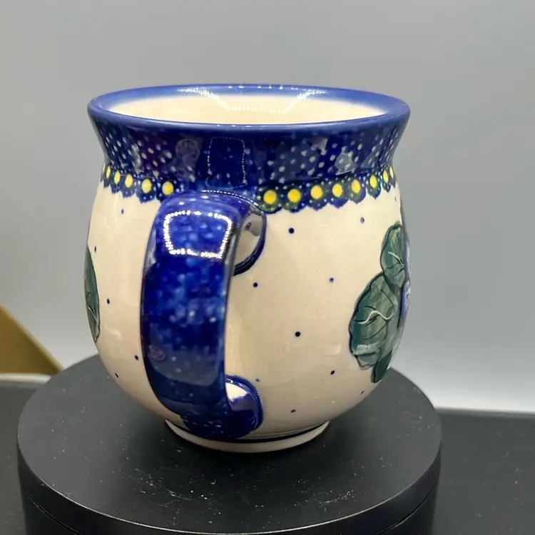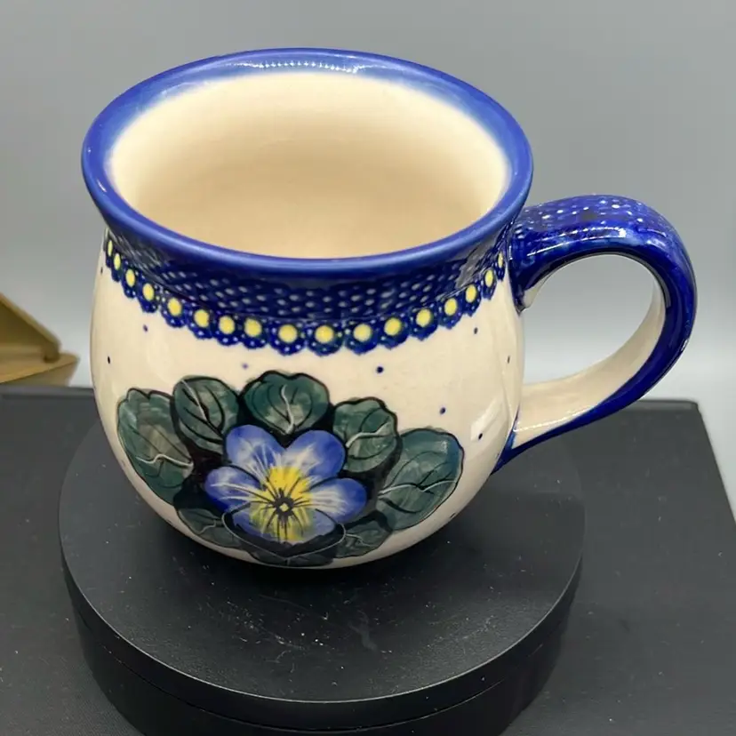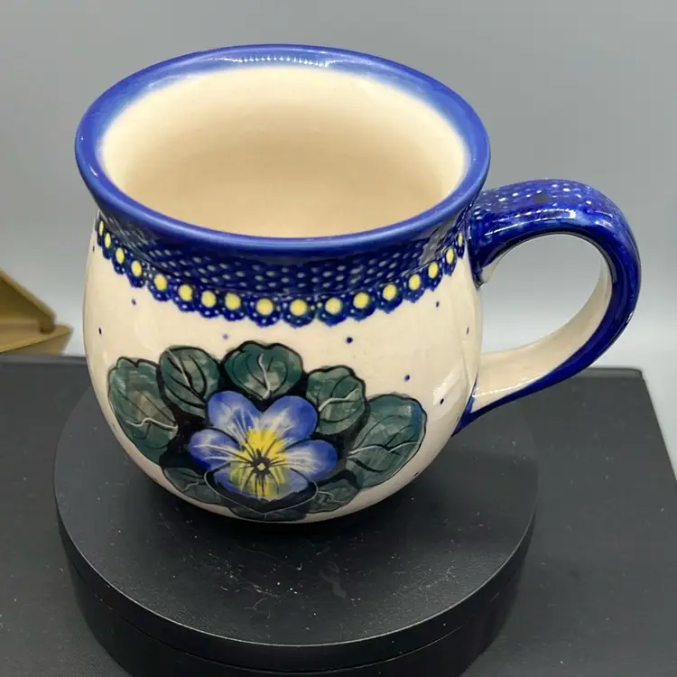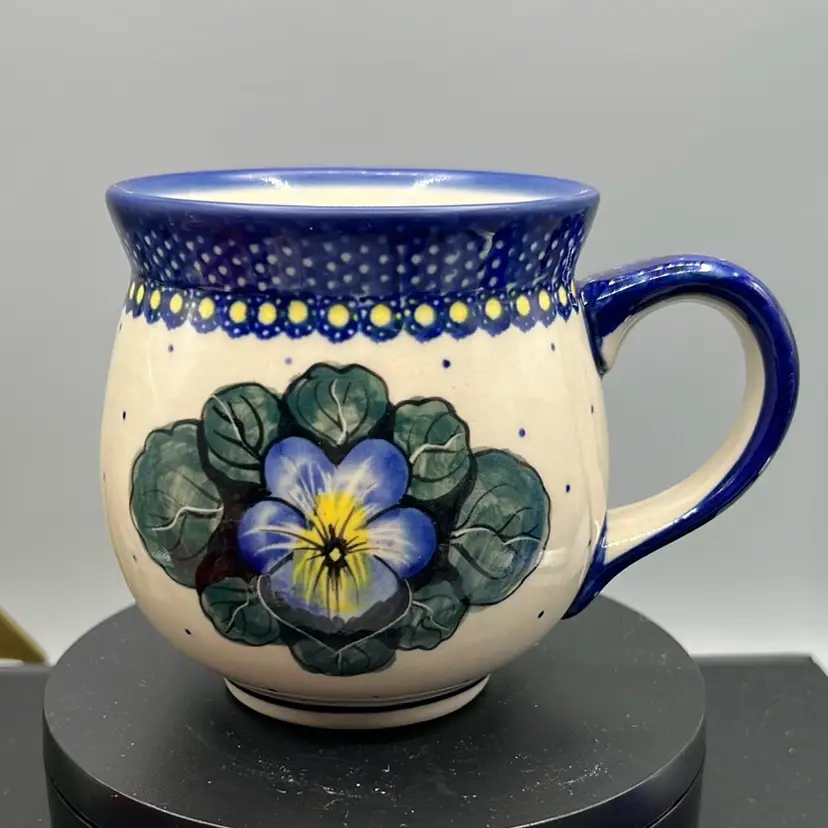 This is a Polish pottery bubble mug featuring the "Pansies" or "Flower In The Grass" pattern.