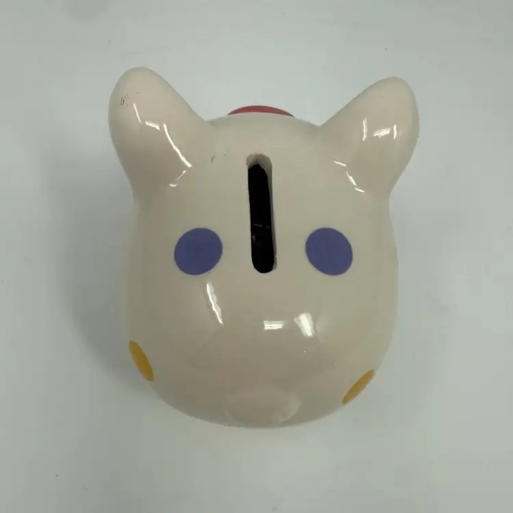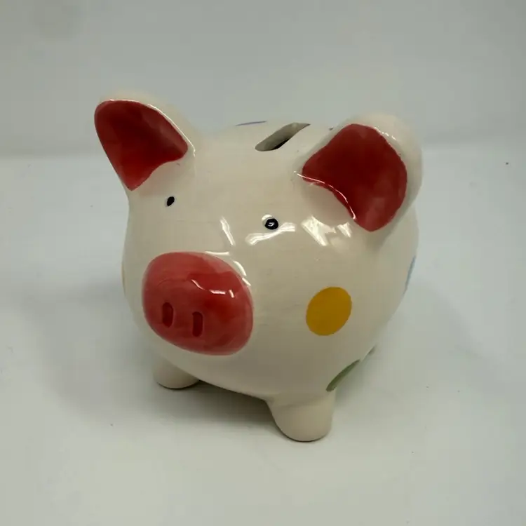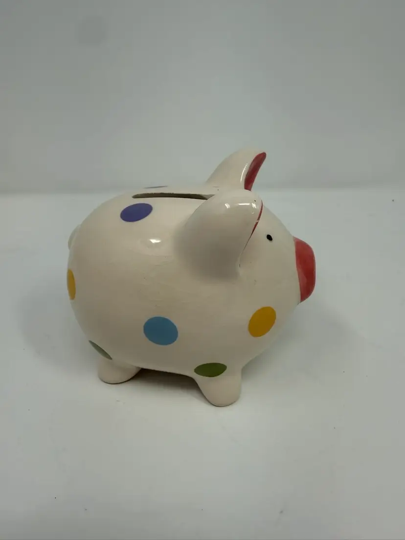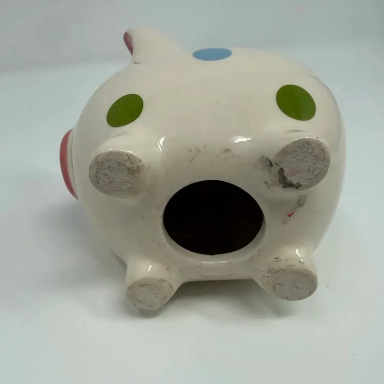 Ceramic piggy bank. White background with multi colored polka dots. Missing stopper. 4.5” x 3.5” x 3.5”