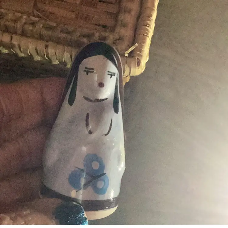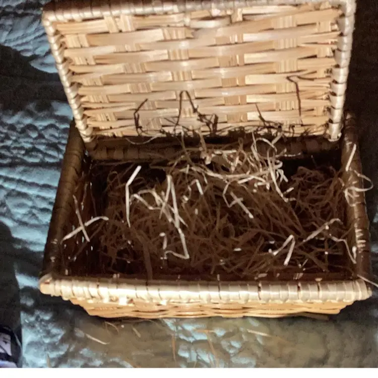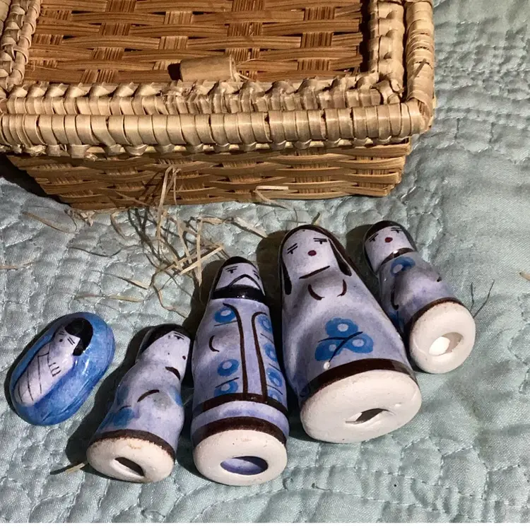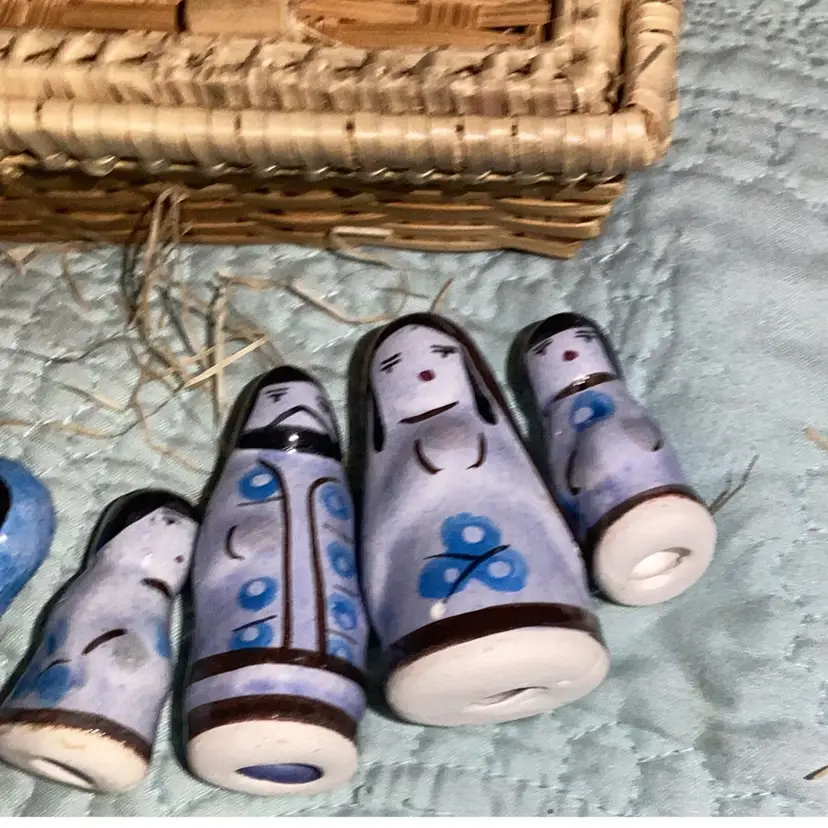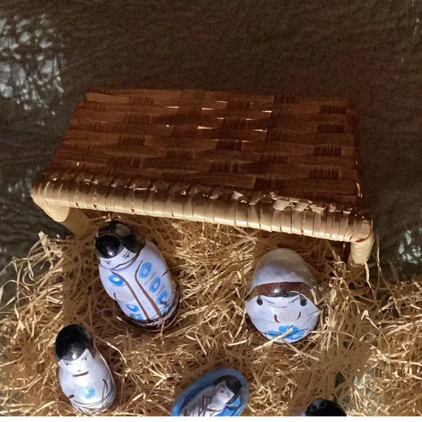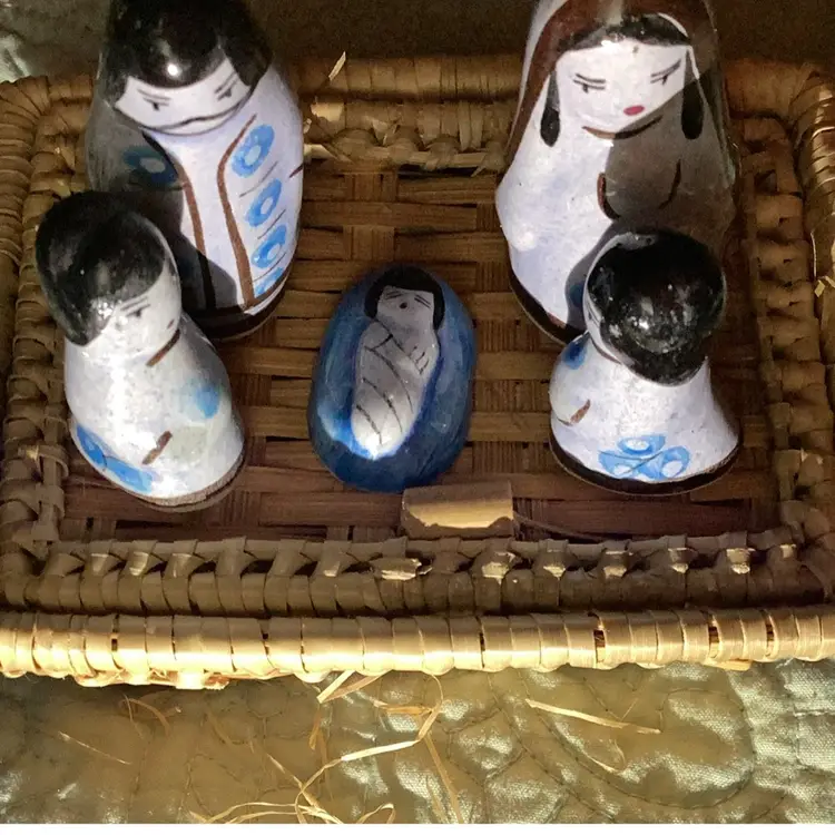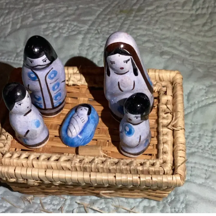 Five pieces of porcelain little statues, Mary Joseph, baby Jesus and I guess Shepherd boys all in a little basket with the hay. Is this such a cute little nativity scene. There is a little chip on the mom on the mother Mary. There’s a little tiny white spot that’s porcelain’s coming off a bit I think but this is the cutest little thing.