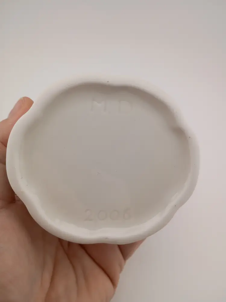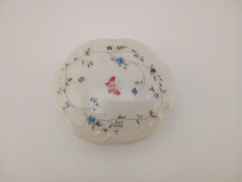 It's a sweet little porcelain trinket box covered in butterflies and flowers. Inside is the in tact "velvet" lining and the base is marked MD 2006. It's in excellent condition with no chips or cracks. Just over 3" long, just under 3" wide.