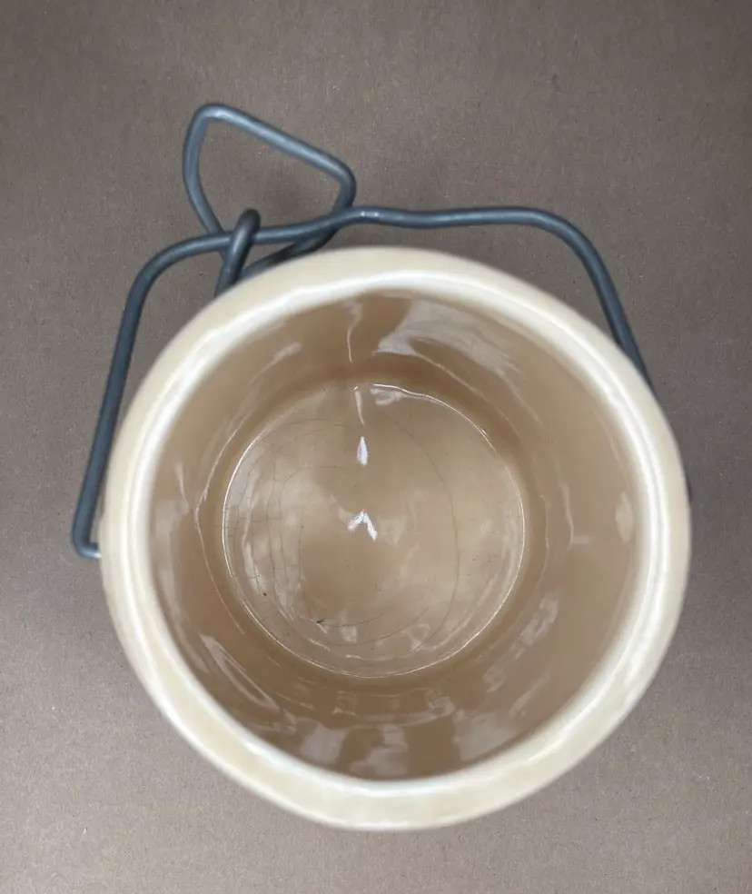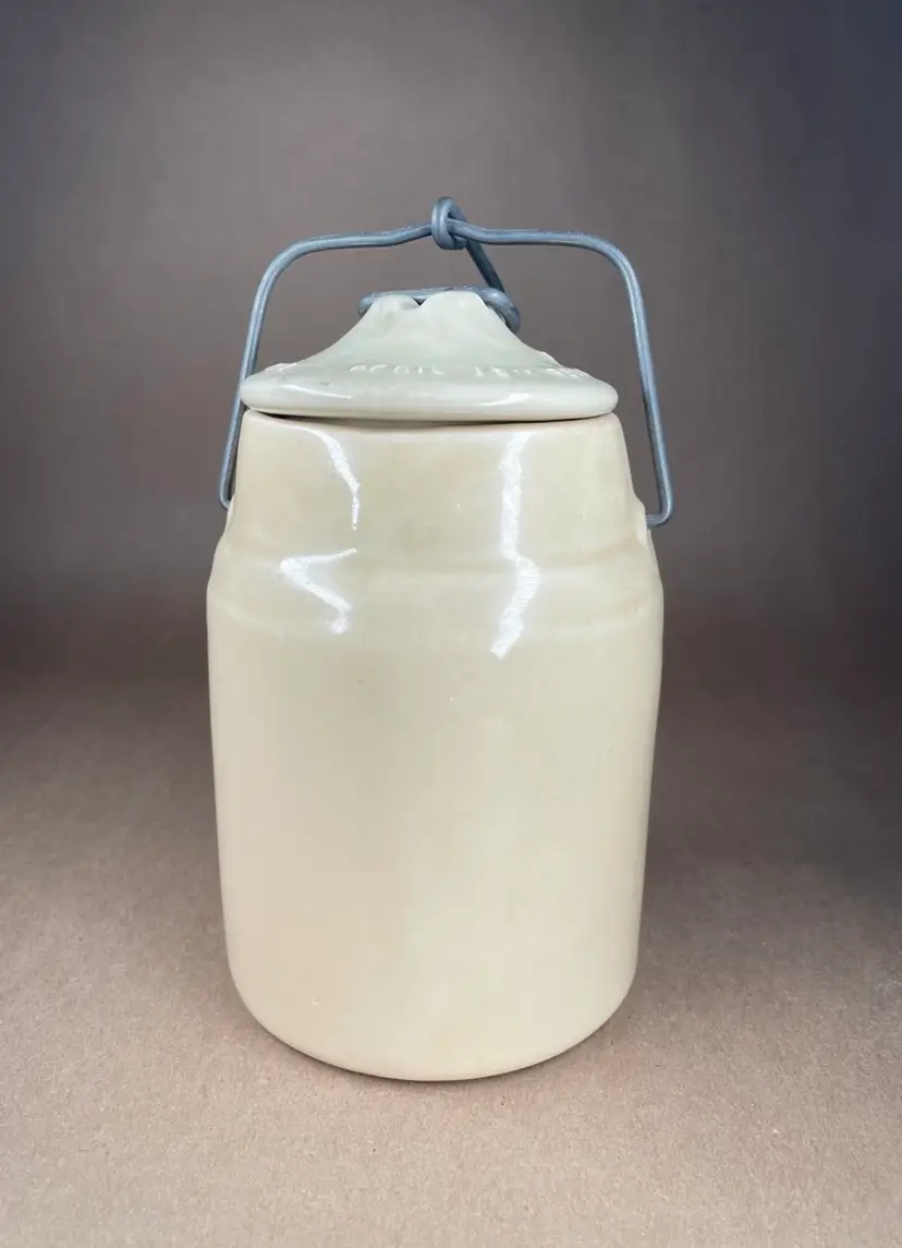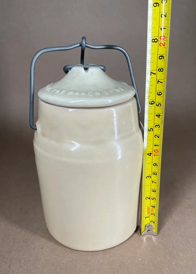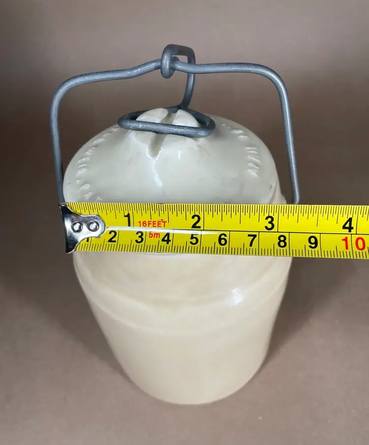 See photos for condition and measurements. Lid closely tightly. Crazing inside the crock.